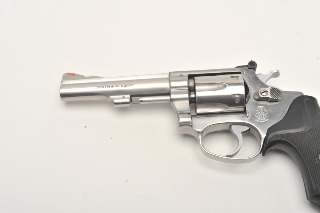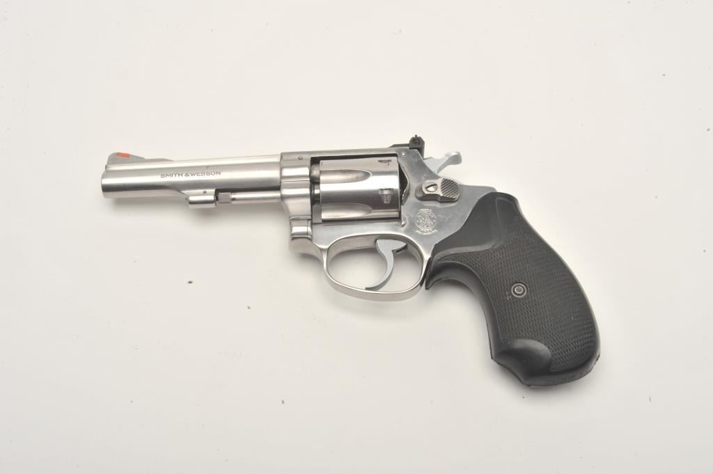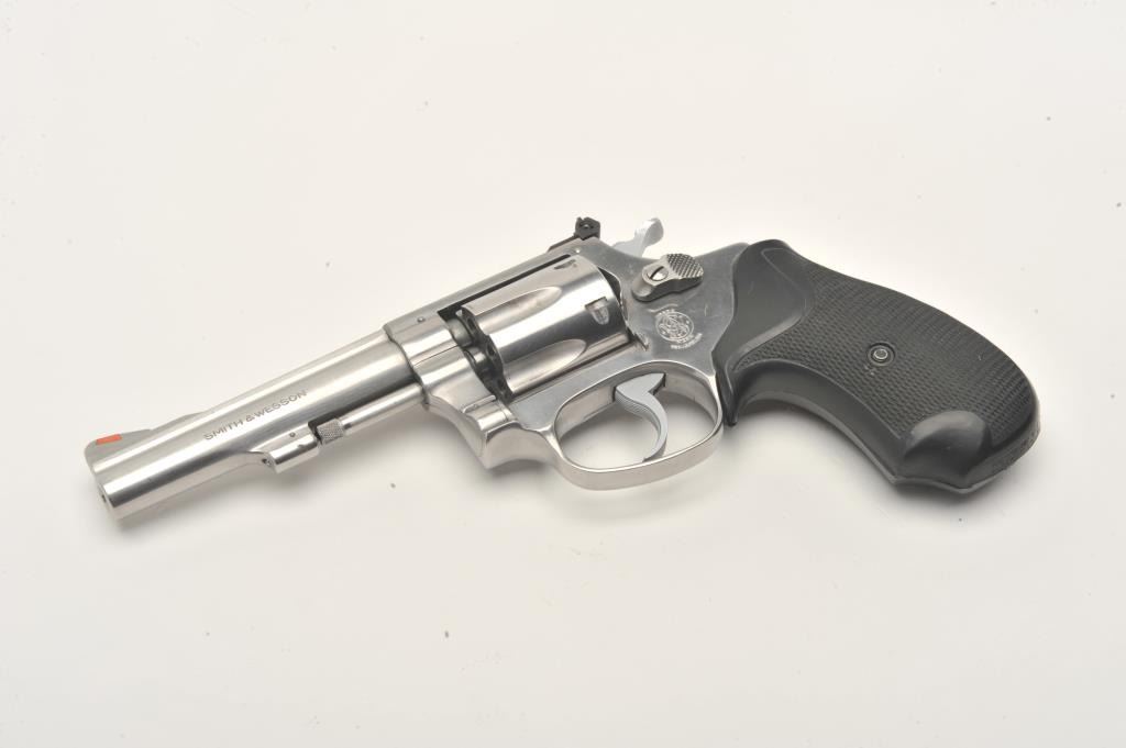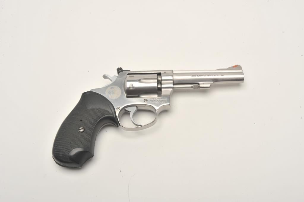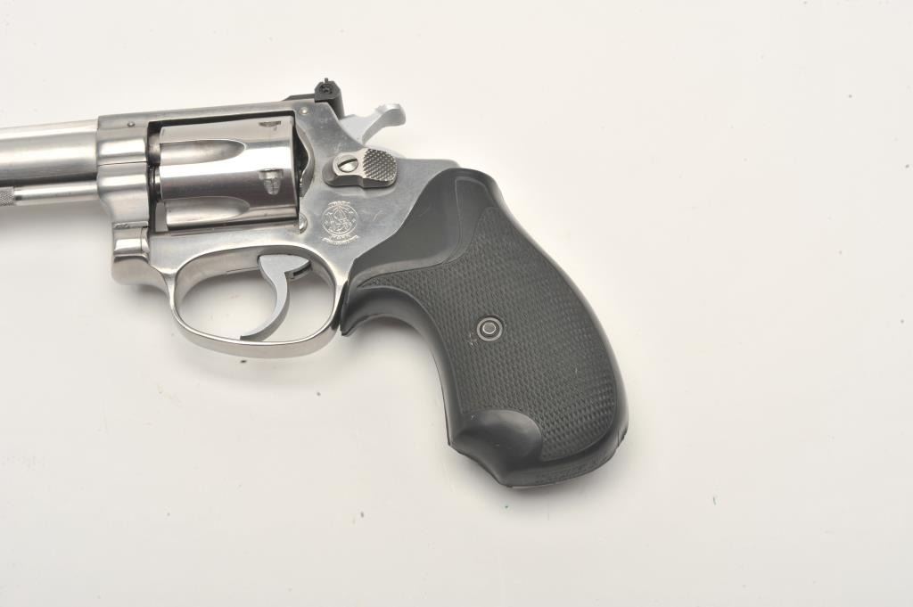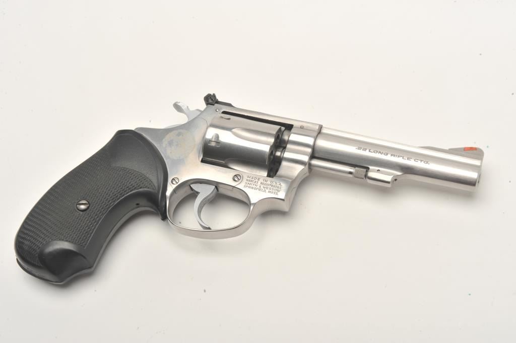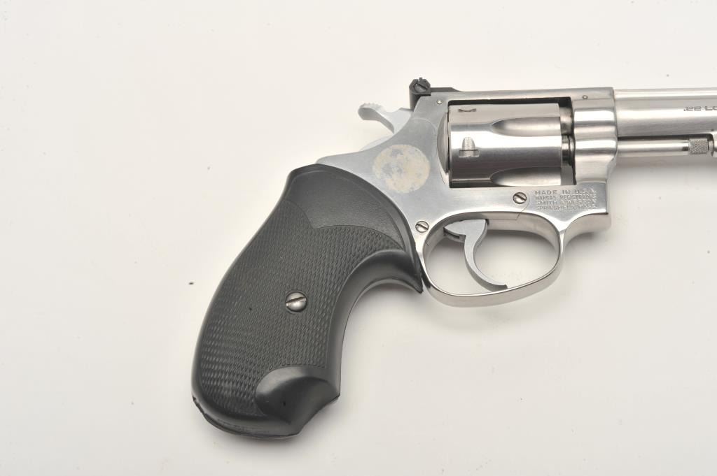 Smith & Wesson Model 63 DA revolver, .22LR caliber, 4” barrel, stainless, checkered hard rubber grip, S/N N160976, in overall very good to near fine condition with a very good bore, crisp action and markings, very goodgrips. (Modern/No PPT/NO CALIF. SALE). Est.: $250-$500.