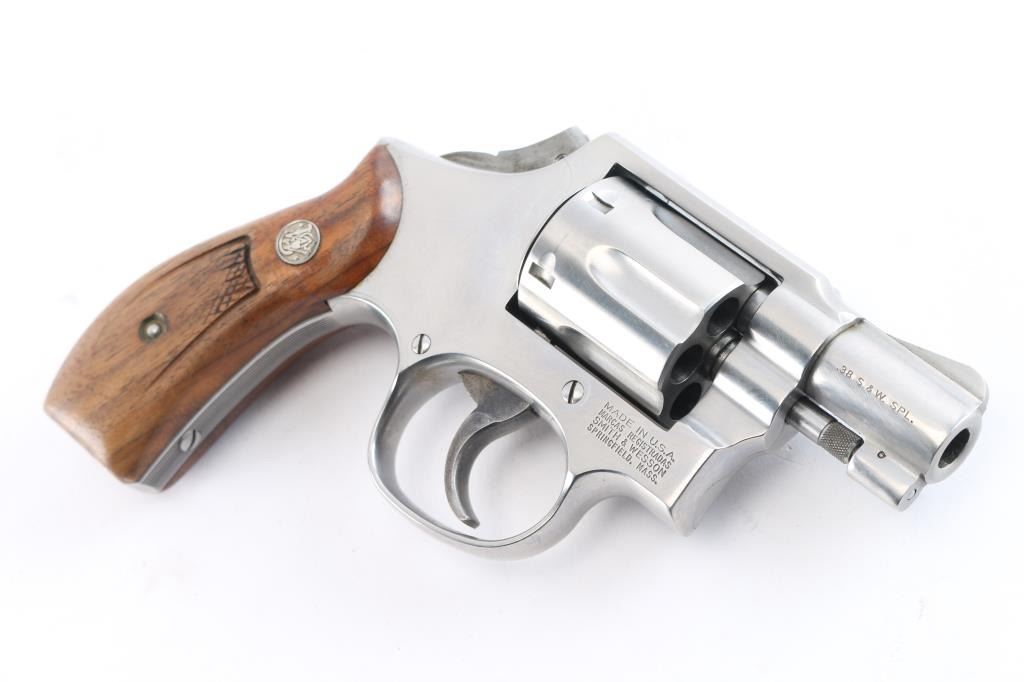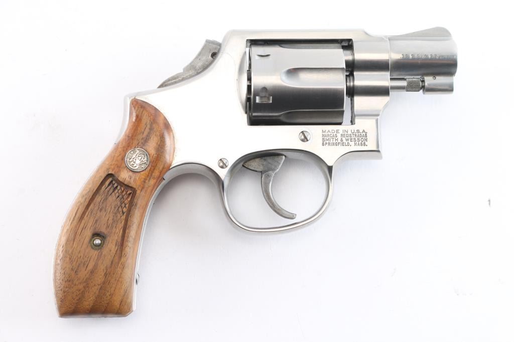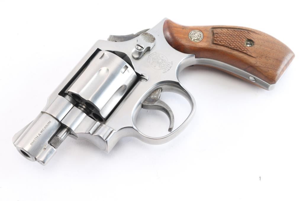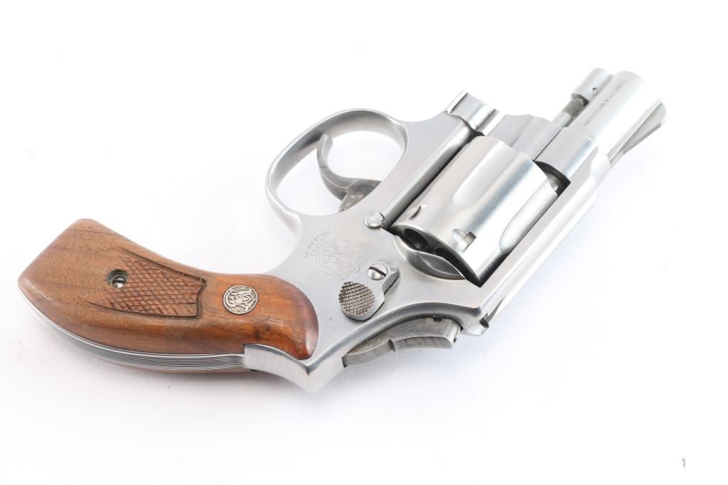 'The .38 Military and Police Stainless,' an American made double-action only (DAO) revolver chambered for .38 Special. The Model 64-4 was released in 1988 and the modifications include a new yoke retention system, radius stud package, hammer nose bushing, and a floating hand on this 2" tapered barrel version. Revolver features a polished stainless steel finish, serrated ramped front sight, notched frame rear sight, six-round fluted cylinder, un-shrouded ejector rod with knurled ejector rod head, checkered cylinder release, round butt 'K' service frame with three screws, color-case bobbed hammer, firing pin on hammer nose, transfer bar safety, color-case smooth curved combat trigger, serrated grip straps, and checkered walnut grips with gold toned Smith & Wesson medallions. The original stainless finish retained is approximately 98% with superficial scratches, a drag line on the cylinder, and a brush mark behind the right side of the recoil shield. Metal displays no rust, but there is slight deformation in the grip screw slot. Action is smooth and crisp with a tight lock-up. Bore is bright with strong rifling, and cylinder chambers are excellent. Walnut grips are fair but serviceable, it appears that the bottom of the grip panels were sanded to change the profile. Approximately half of the grip panel's checkering remains.