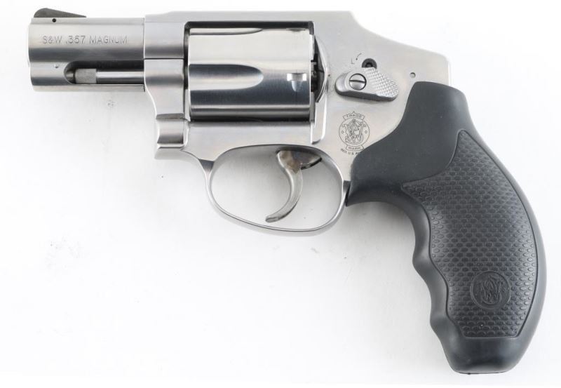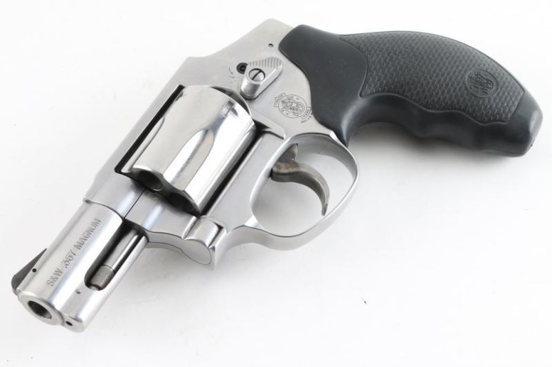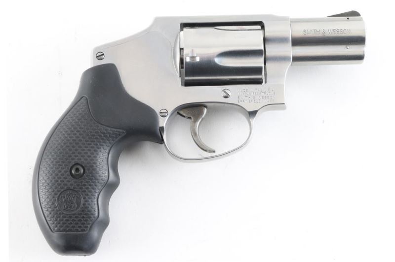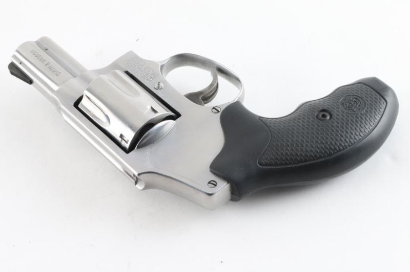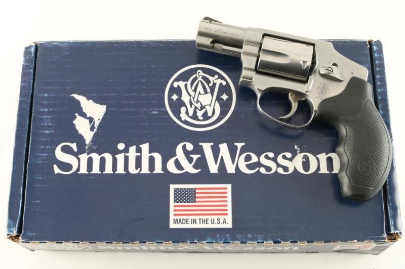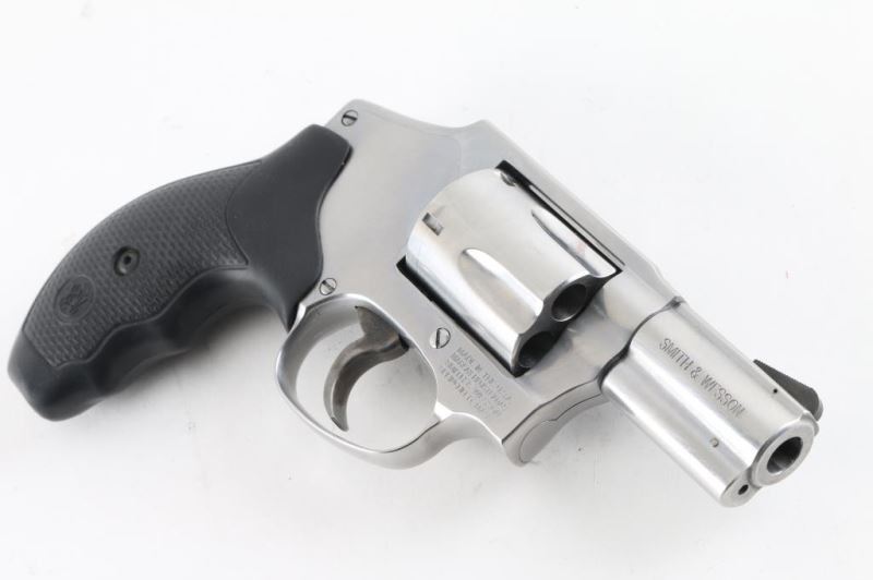 Small frame double action only revolver. Features stainless steel construction, 2.125" bbl, internal hammer, ramp front sight, square notched rear sight, fluted five shot cylinder, frame lock, textured black rubber grips with S&W emblems. Revolver shows little wear, slight drag line on cylinder. Action is crisp with solid lock-up, bore is excellent and grips are fine. Includes factory cardboard box with papers. Condition is NRA Excellent *** Modern Firearm ***