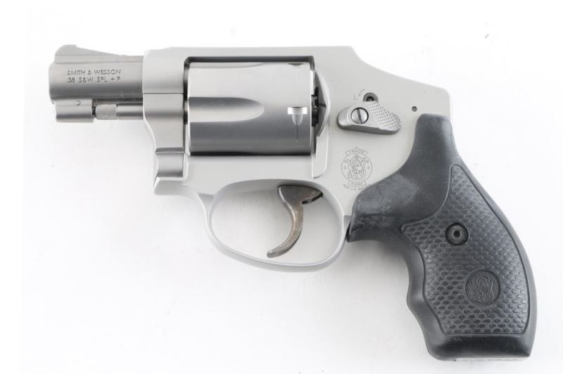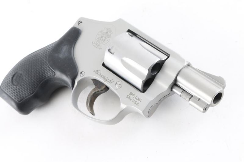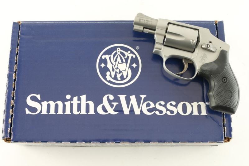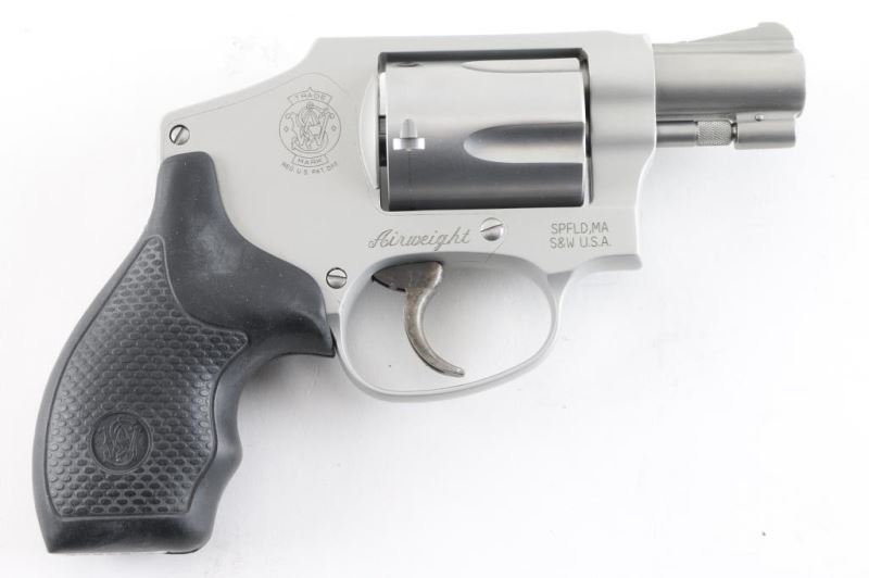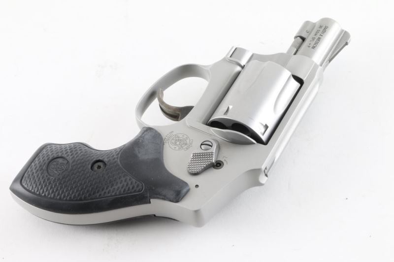 'Airweight' Small frame double action only revolver. +P rated. Features satin silver/gray finish (stainless steel & matching color alloy), internal hammer, 1.78" barrel, ramp front sight, square notched rear sight, fluted five shot cylinder, frame lock, textured black rubber grip with S&W emblems. Revolver shows little wear, slight drag line on cylinder. Action is crisp with solid lock-up, bore is excellent and rubber grips are fine. Includes factory cardboard box with papers. Condition is NRA Excellent *** Modern Firearm ***
