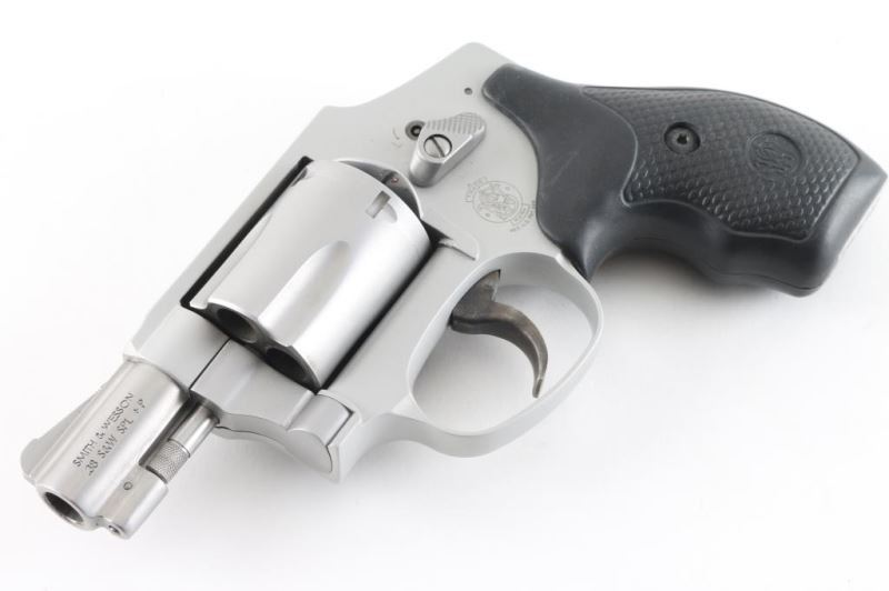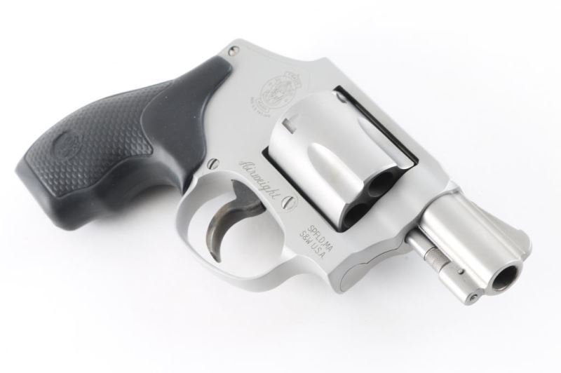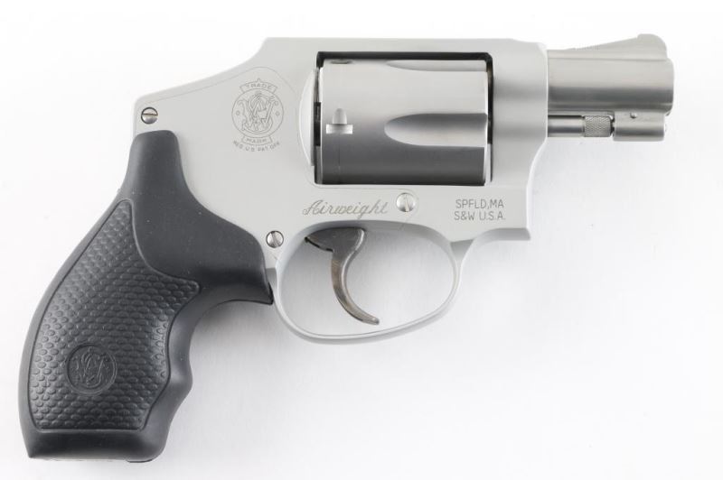 'Airweight' Small frame double action only revolver. +P rated. Features satin silver/gray finish (stainless steel & matching color alloy), 1.78" bbl, internal hammer, ramp front sight, square notched rear sight, fluted five shot cylinder, frame lock, textured black rubber grip with S&W emblems. Revolver shows little wear, slight drag line on cylinder. Action is crisp with solid lock-up, bore is excellent and rubber grips are fine. Condition is NRA Excellent *** Modern Firearm ***