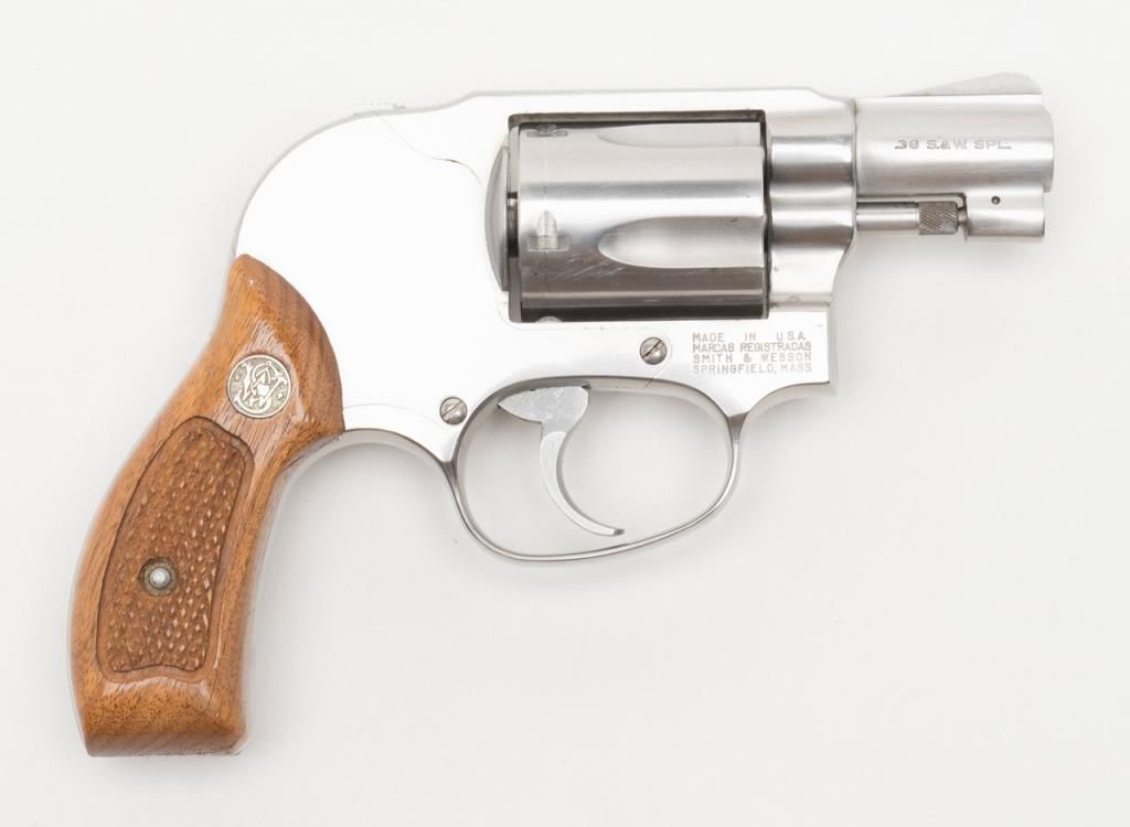 Smith & Wesson Model 649 DA revolver, .38 Special cal., 1-3/4” barrel, shrouded hammer, stainless steel, checkered wood medallion grips, #ALB7632 in overall fine condition with a fine bore, crisp action, sharp markings and fine grips.(Modern/PPT). Est.: $250-$350.