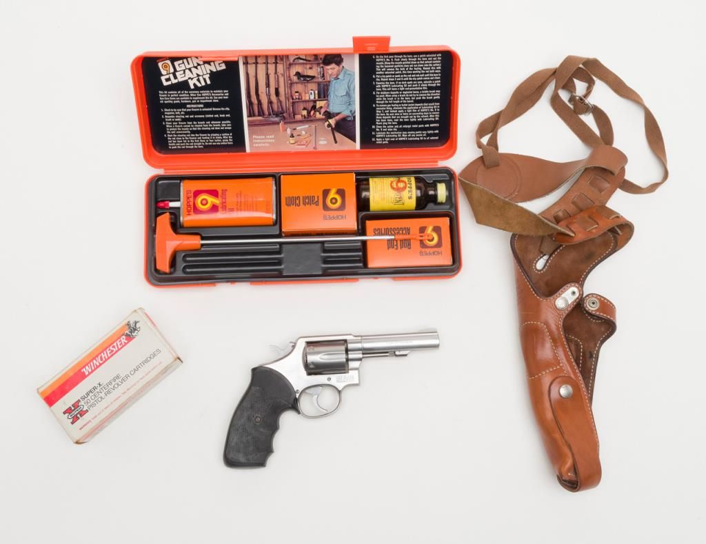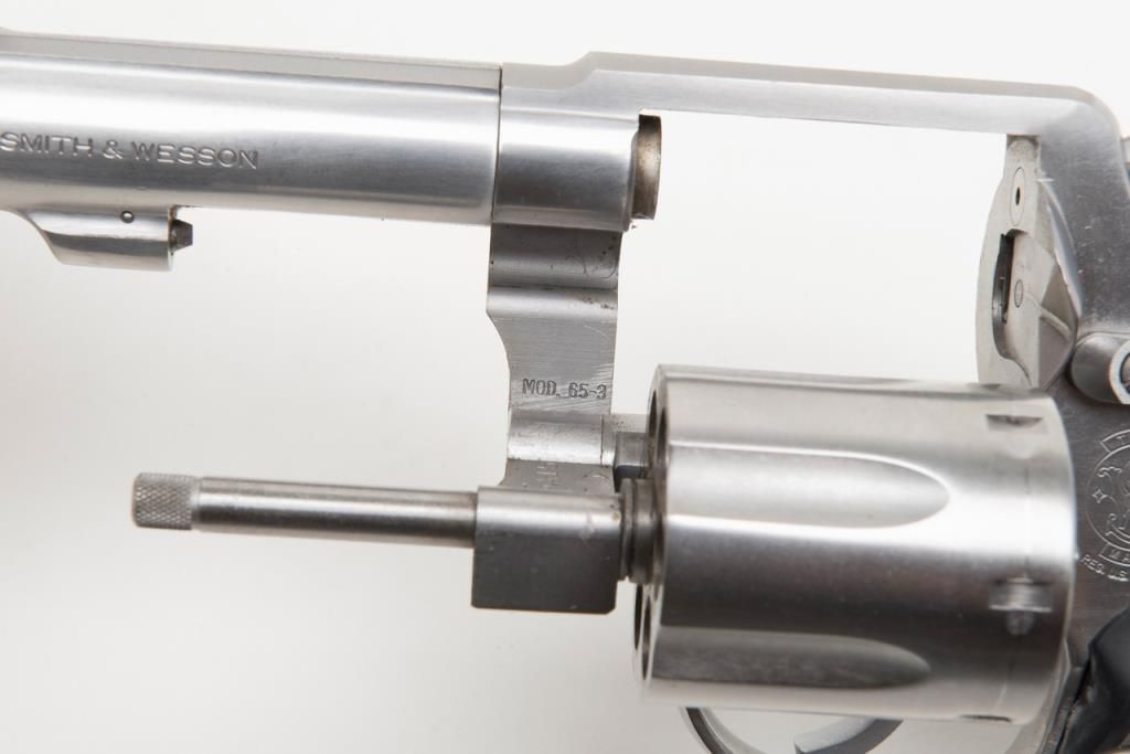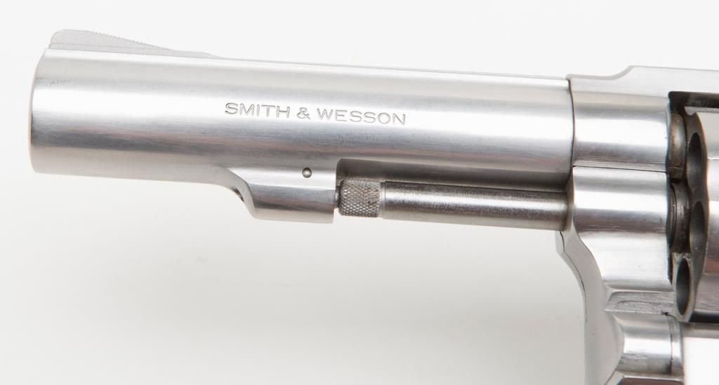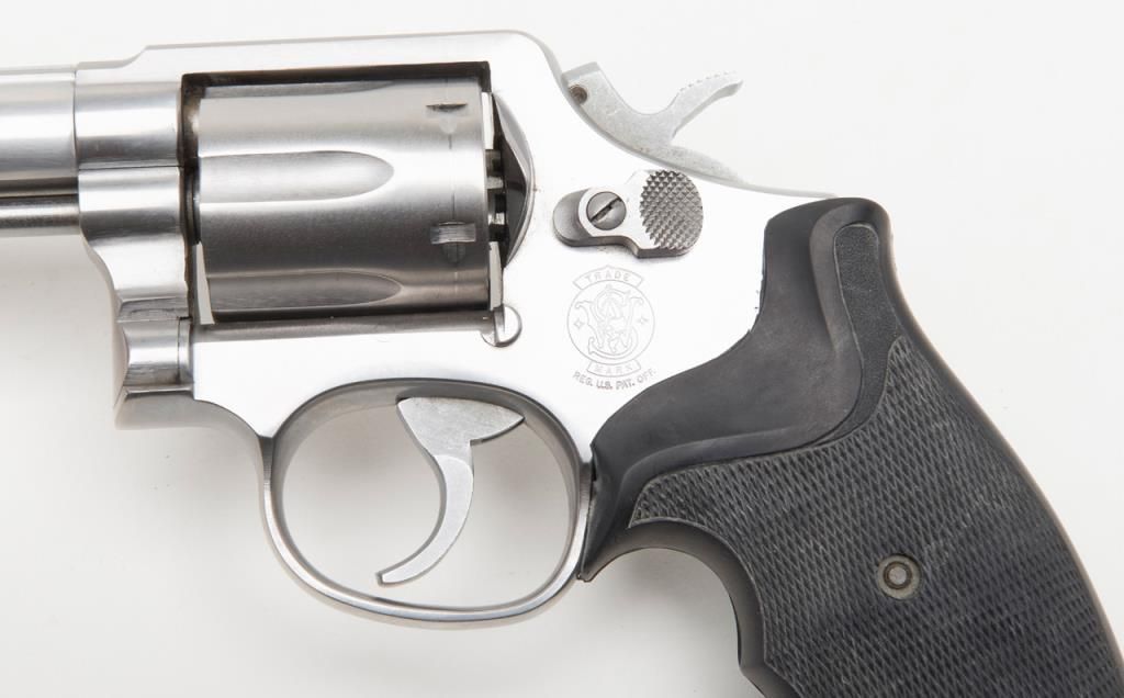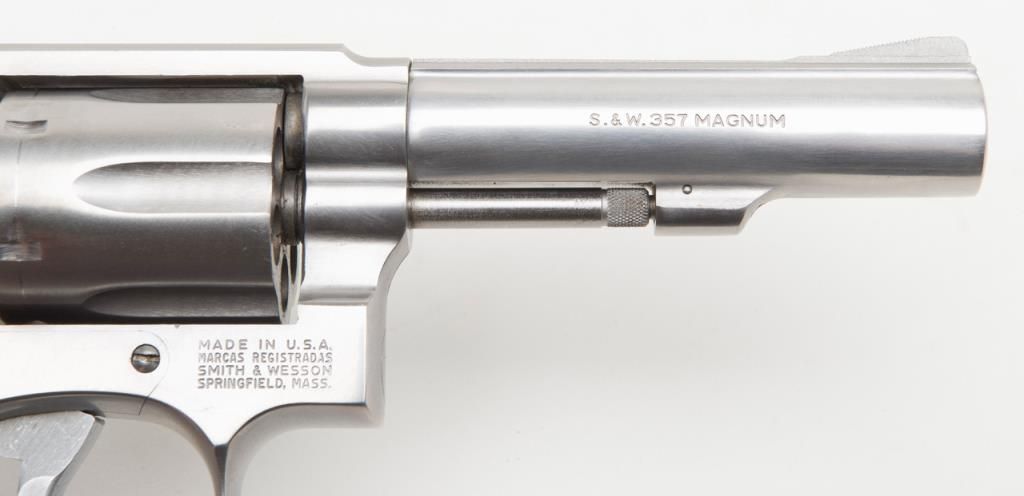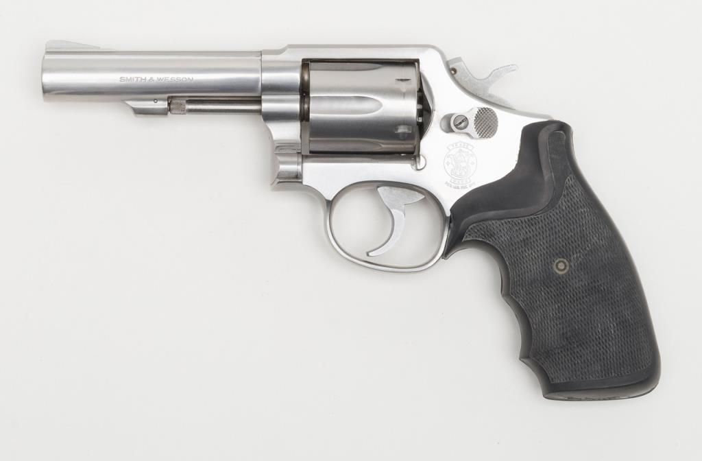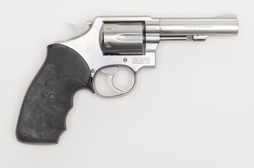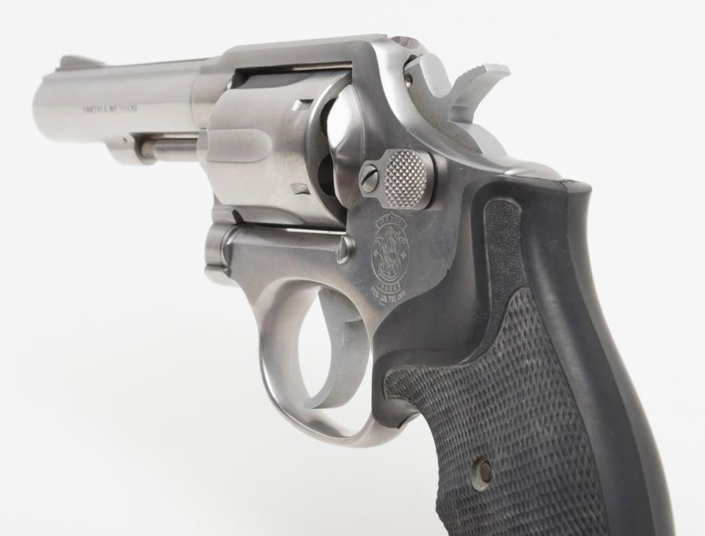 Smith & Wesson Model 65-3 revolver, cal. .357 Magnum, Serial #AJD7831. The pistol is in overall fine condition with a 4” barrel. The pistol retains nearly all of its stainless steel finish, with black, checkered rubber grips. The bore isfine, the action crisp and markings sharp on this pistol. The pistol includes a leather Bianchi shoulder holster and Hoppe’s cleaning kit. (Modern/PPT). Est.: $300-$600.