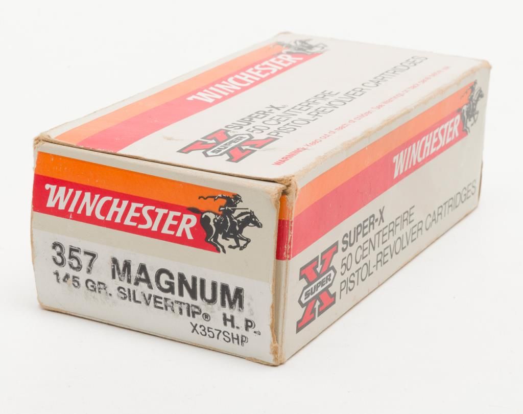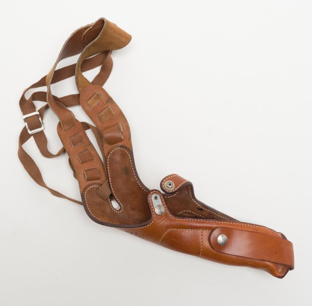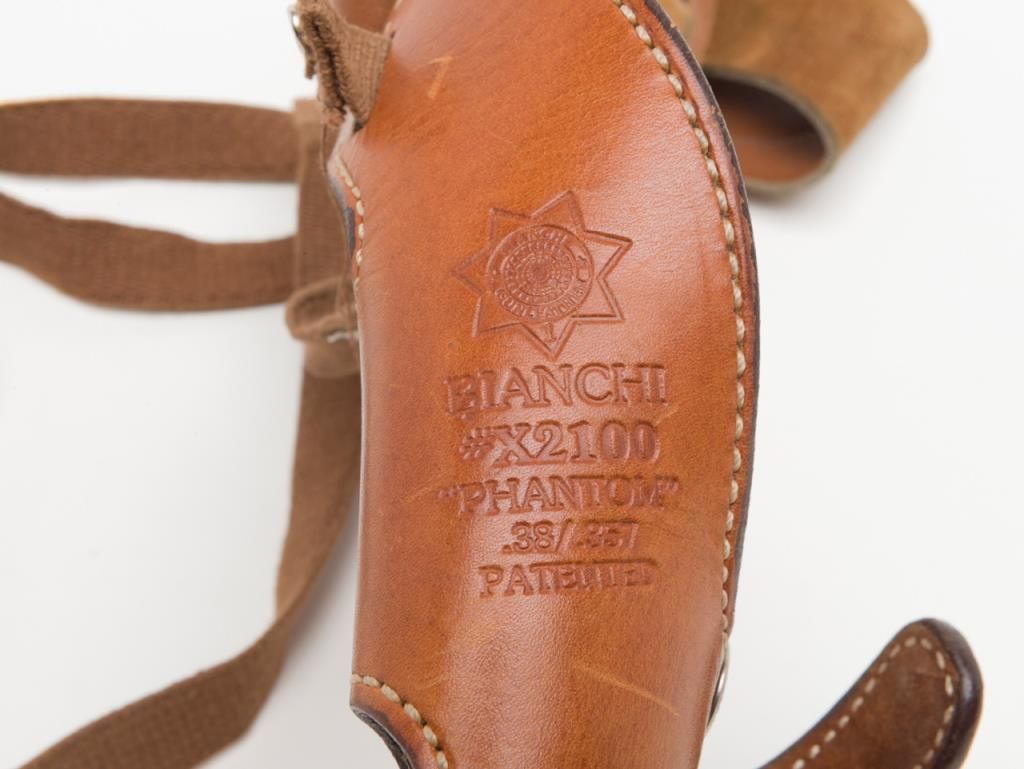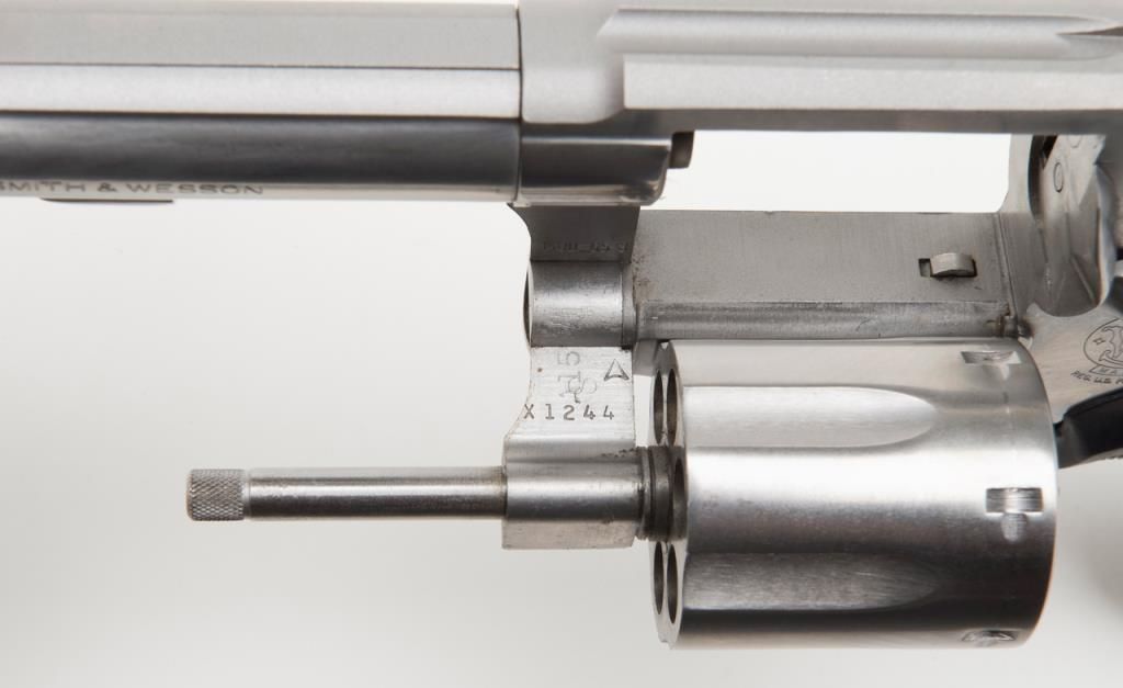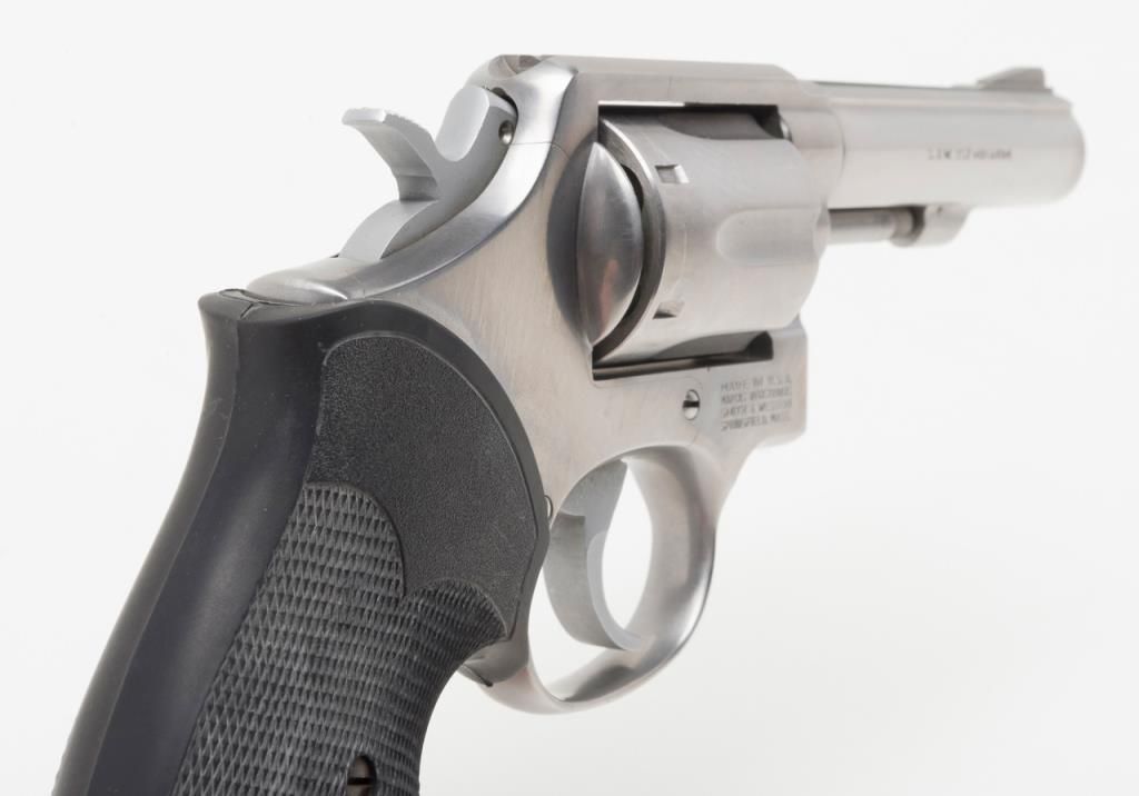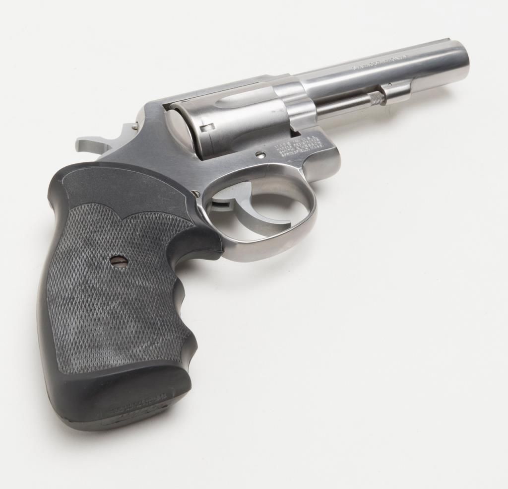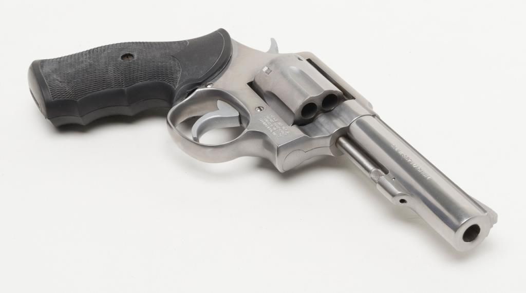 Smith & Wesson Model 65-3 revolver, cal. .357 Magnum, Serial #AJD7831. The pistol is in overall fine condition with a 4” barrel. The pistol retains nearly all of its stainless steel finish, with black, checkered rubber grips. The bore isfine, the action crisp and markings sharp on this pistol. The pistol includes a leather Bianchi shoulder holster and Hoppe’s cleaning kit. (Modern/PPT). Est.: $300-$600.