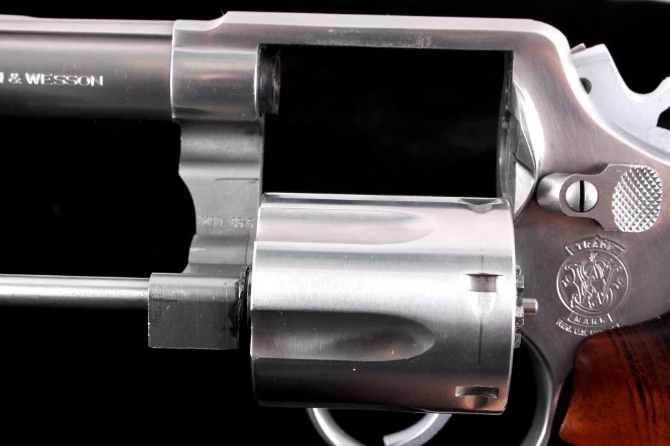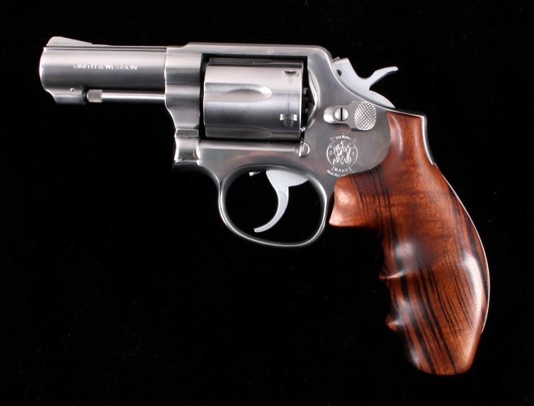 This is a Smith & Wesson Model 65-5 double action revolver chambered in the .357 Magnum caliber with a 3" barrel. The revolver features a bright stainless finish throughout with premium deluxe solid hardwood contoured grips. The barrel is marked "Smith & Wesson S.&W. .357 Magnum". The frame is marked with the Smith & Wesson emblem near the cylinder latch and on the other side "Made in U.S.A. Marcas Registradas Smith & Wesson Springfield, Mass.". The revolver shows very good condition with only minor wear on the cylinder. It measures 8" long overall with a 3" barrel. Serial number is BBN1302. This is a modern manufactured handgun and requires an FFL or NICS background check to transfer.