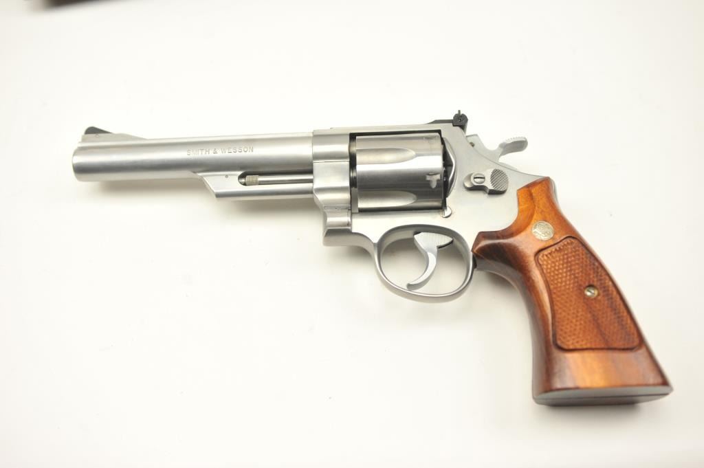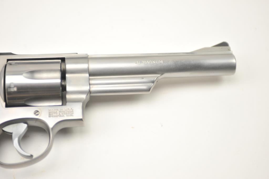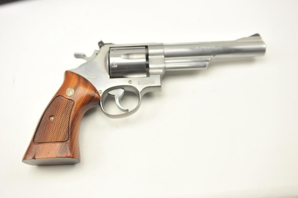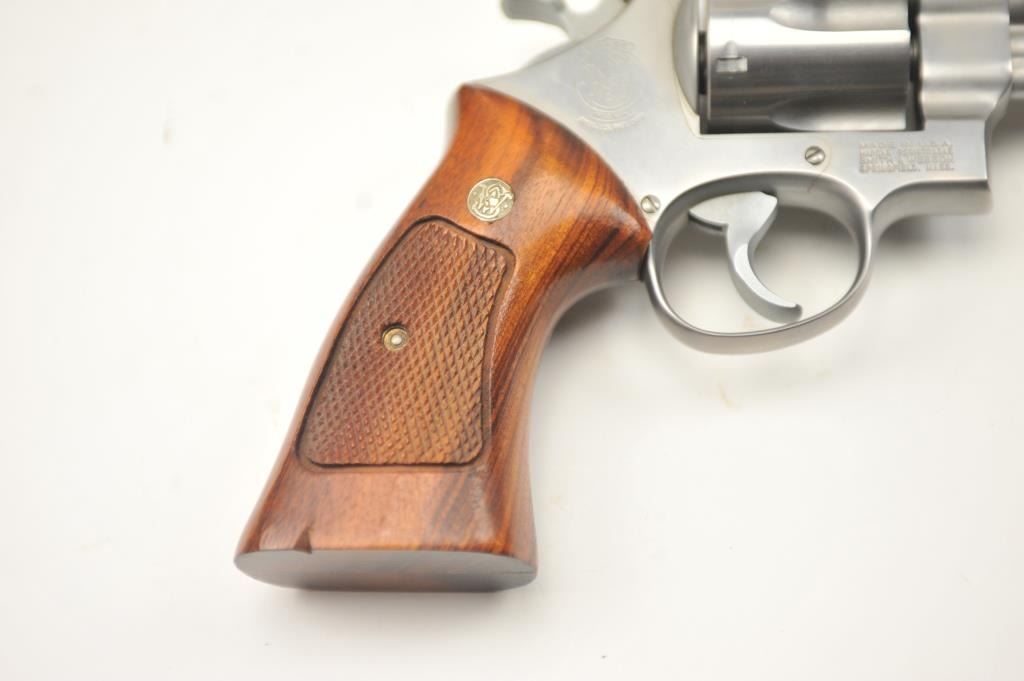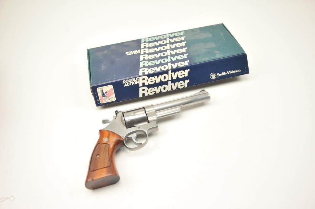 Smith & Wesson Model 657 Double Action Stainless Steel revolver in .41 Mag caliber with a 6” barrel, S/N AV87040 in box showing special order code 8130 with target stocks and target trigger. Near fine used conditionshowing some firing darkening and residue that will clean. Scarce.; (Modern/PPT) Est.: $600-$1200