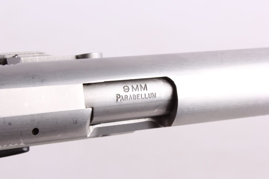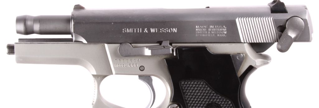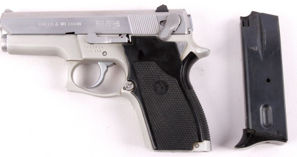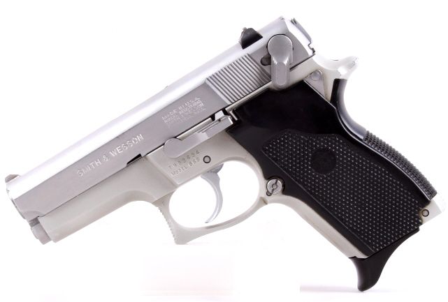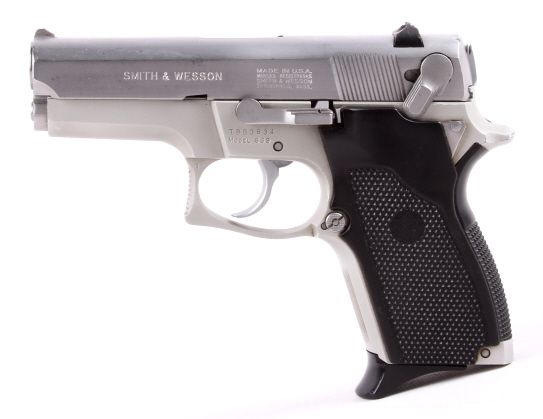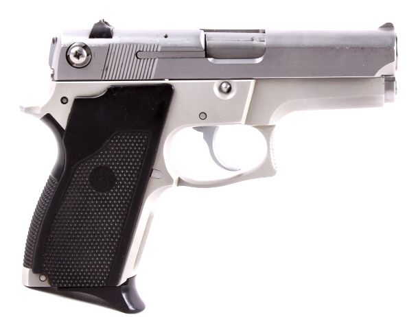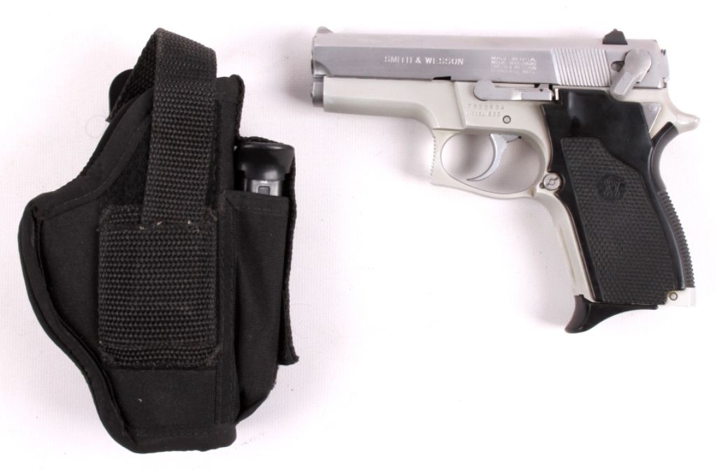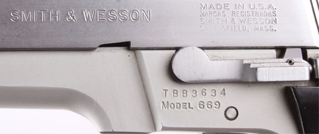 This is a 9mm auto loading Smith & Wesson Model 669 that comes with two clips and a holster. The gun is in excellent condition and has a double action trigger.