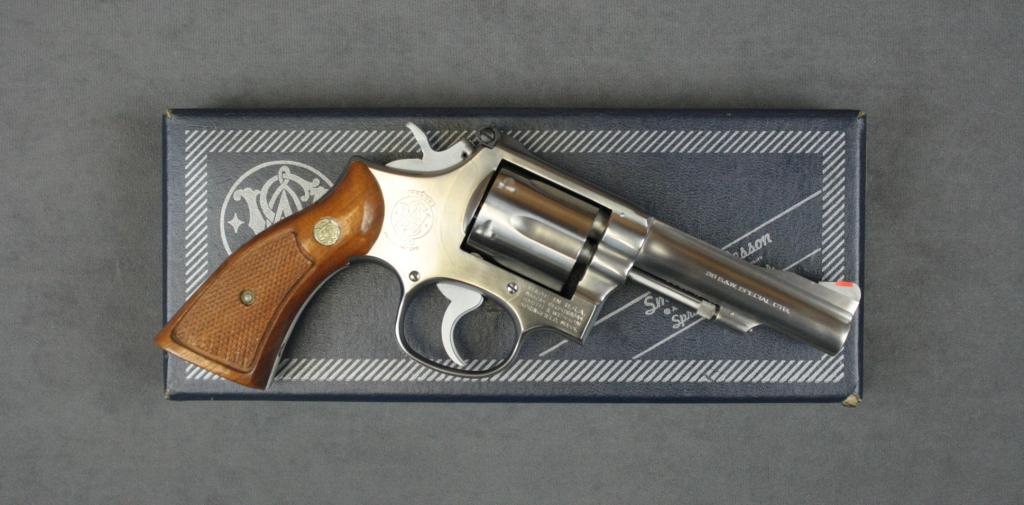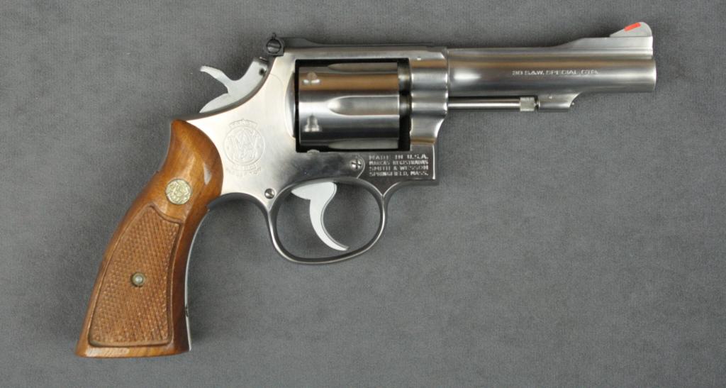 Smith & Wesson Model 67-1 DA revolver, .38 Special cal., 4” barrel, stainless steel, checkered medallion wood grips, #77K6069. This gun is in overall excellent condition showing little use, fine bore, action,markings and grips; accompanied by factory box numbered to this gun with instructions and factory cleaning kit. Est.: $350-$700.