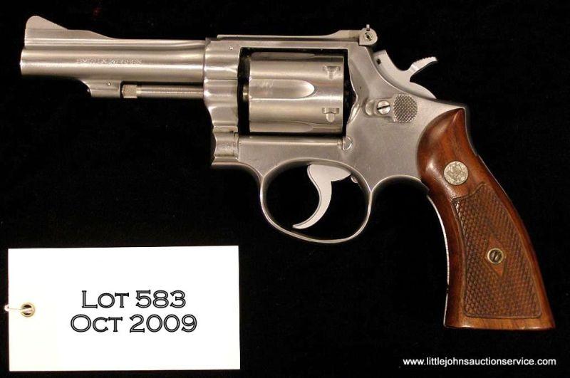 Smith & Wesson Model 67, #3K89182, .38 Spl., stainless, 4" barrel, adjustable sights, checkered wood diamond medallion grips. Revolver is in good to very good condition showing light scratches on the cylinder flutes from cleaningwith a wire brush. Bore is bright, grips are near excellent showing slight mars from handling and use. Est. $200-$400.