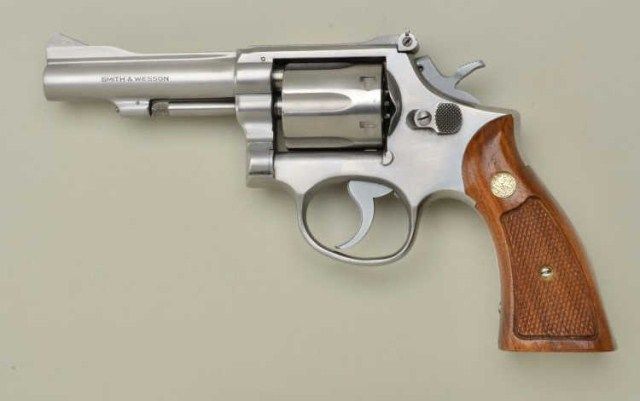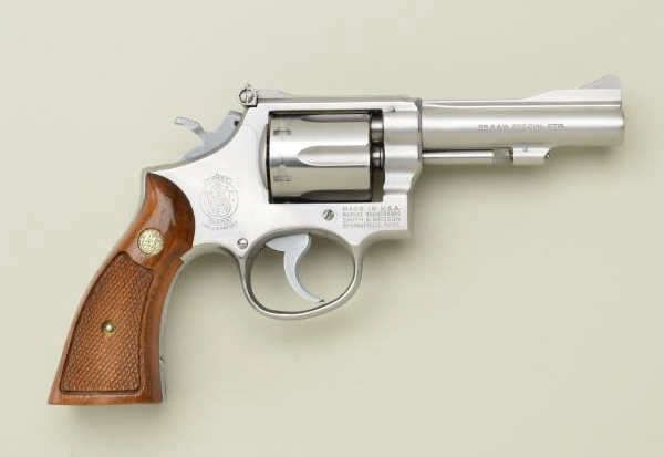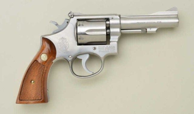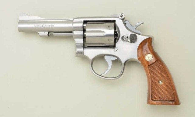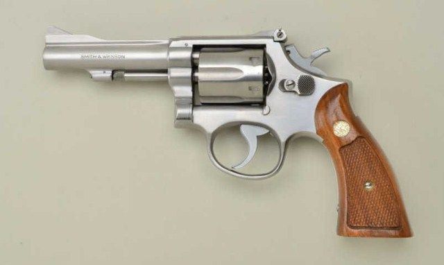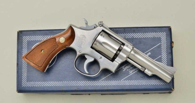 Smith & Wesson Model 67 (no dash) DA revolver, .38 Special cal., 4” barrel, stainless steel, checkered wood medallion grips, #5K50574 with factory blue two-piece cardboard box. This gun is in overall finecondition showing a fine bore, crisp action and markings, fine grips and overall fine factory box. Est.: $400-$800.
