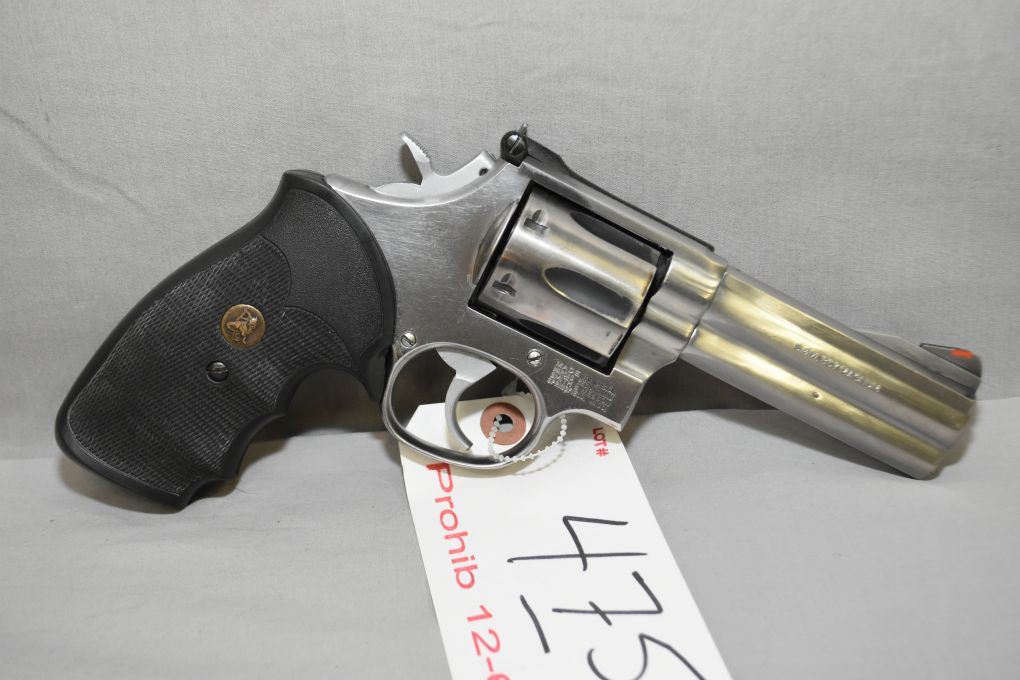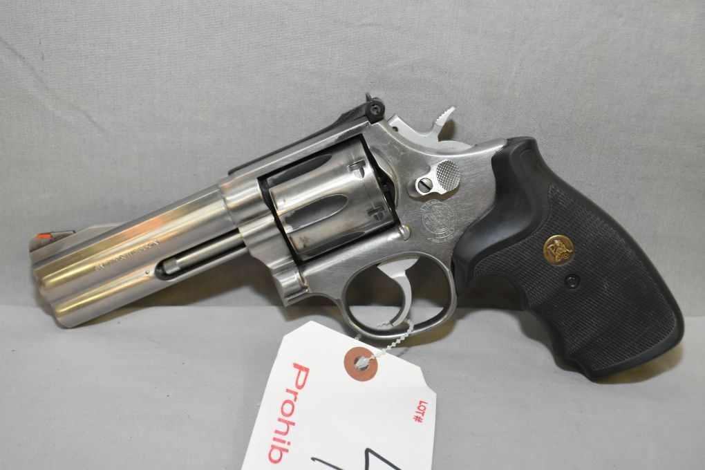 Smith & Wesson Model 686 - 1 .357 Mag Cal 6 Shot Revolver w/ 101 mm bbl [ stainless finish, blued sights, Pachmayr rubber grips, shows some use, faint cylinder ring ] Ser # AWM 3339 12 - 6 Prohib Cert # 2637214 EXPECTS SOME DELAYS IN TRANSFER