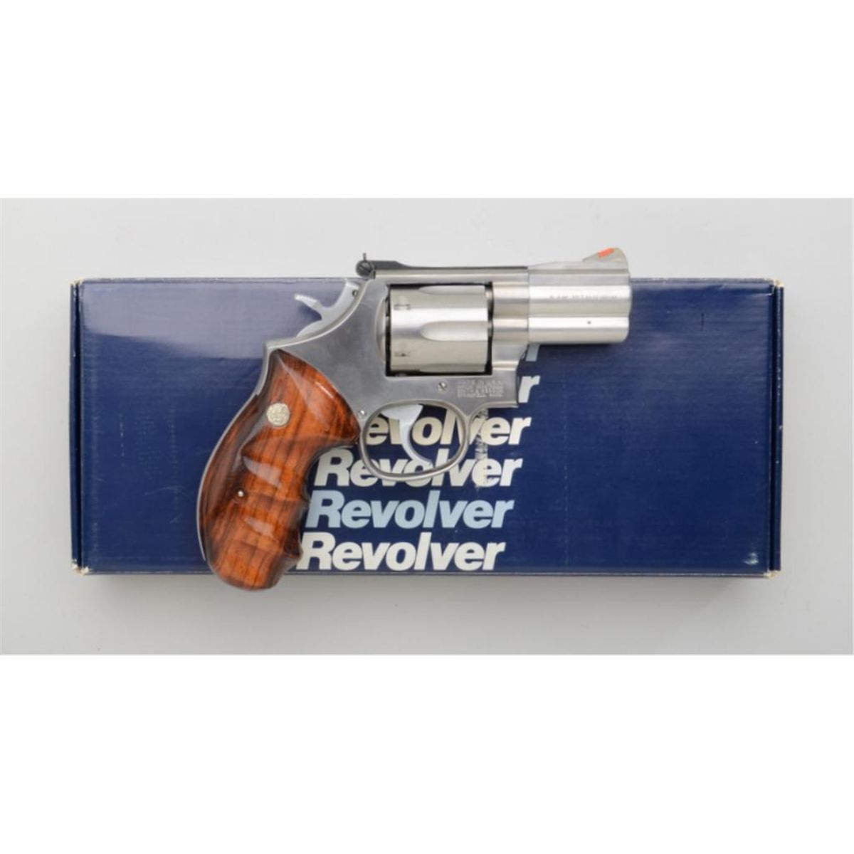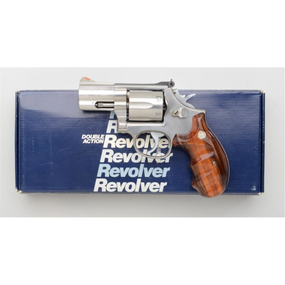 Smith & Wesson Model 686-2 DA revolver, .357 Magnum cal., 2-1/2” barrel, stainless steel, finger grooved hardwood medallion grips, #BAF4195 with factory blue one-piece cardboard box and instructions; end labelnumbered to this gun; in overall excellent condition with excellent bore, action, markings and grips. Est.: $300-$600.