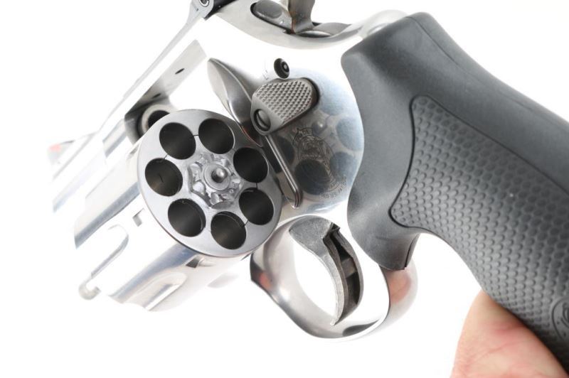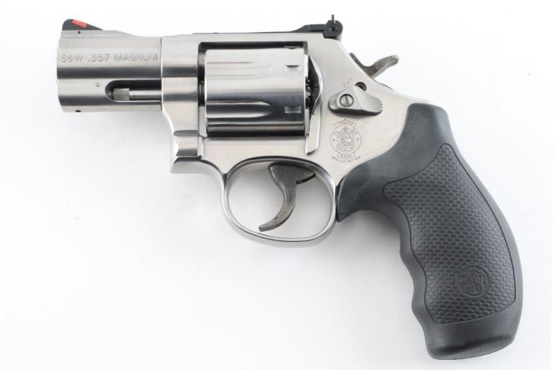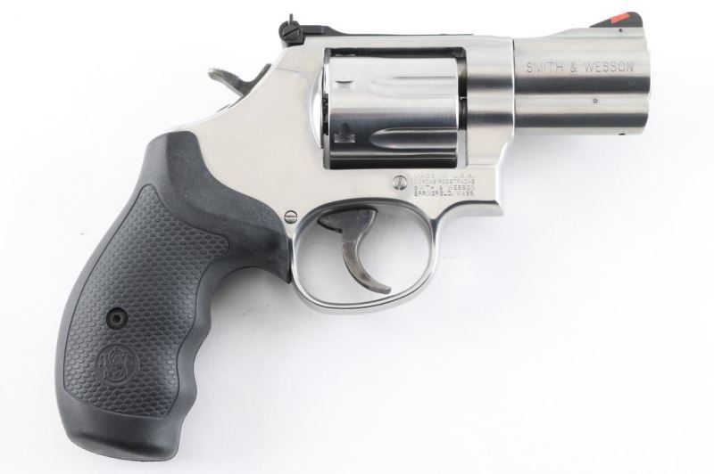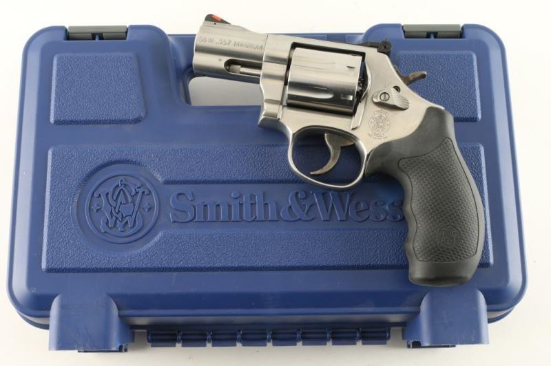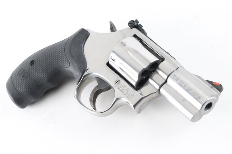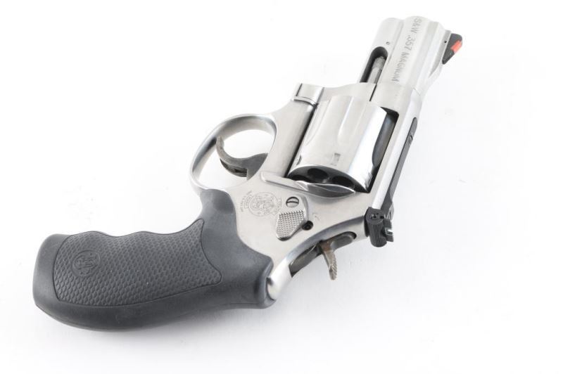 "7 shot" double/single action revolver built on the "L" frame, features stainless steel construction, contoured rubber Hogue style target style grips with molded-in S&W emblems, 2.5" barrel with full length underlug, adjustable sights with orange ramp and white outline rear, key lock safety in frame. Bore is excellent. Overall condition is excellent with few signs of handling and use. Action is smooth with tight lock-up. Includes factory blue plastic box with papers. Condition is NRA Excellent *** Modern Firearm ***