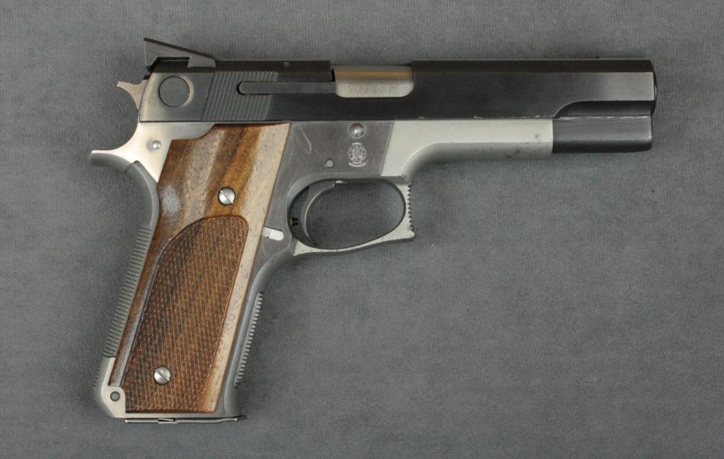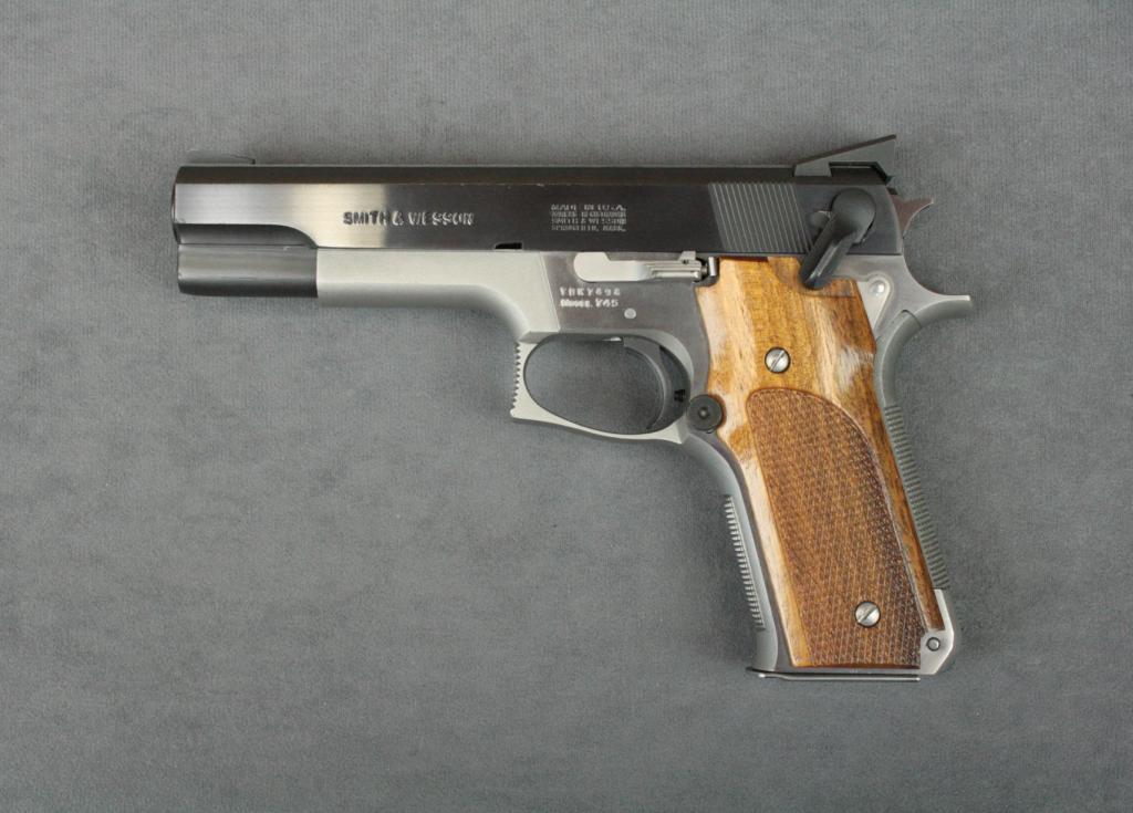 Smith & Wesson Model 745 semi-auto pistol,  .45 cal., 5” barrel, blued slide and  stainless frame, checkered wood grips,  #TBK7494.  This gun is in overall excellent  condition showing little use, stippled gripstraps, adjustable rear sight, fine bore,  crisp action, sharp markings; accompanied by  a Galco leather holster, four additional  magazines and a leather double magazine belt  holder. This model was introduced in 1986 and discontinued in 1990.  Est.:  $400-$600.