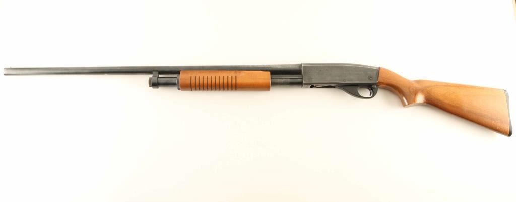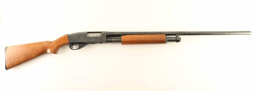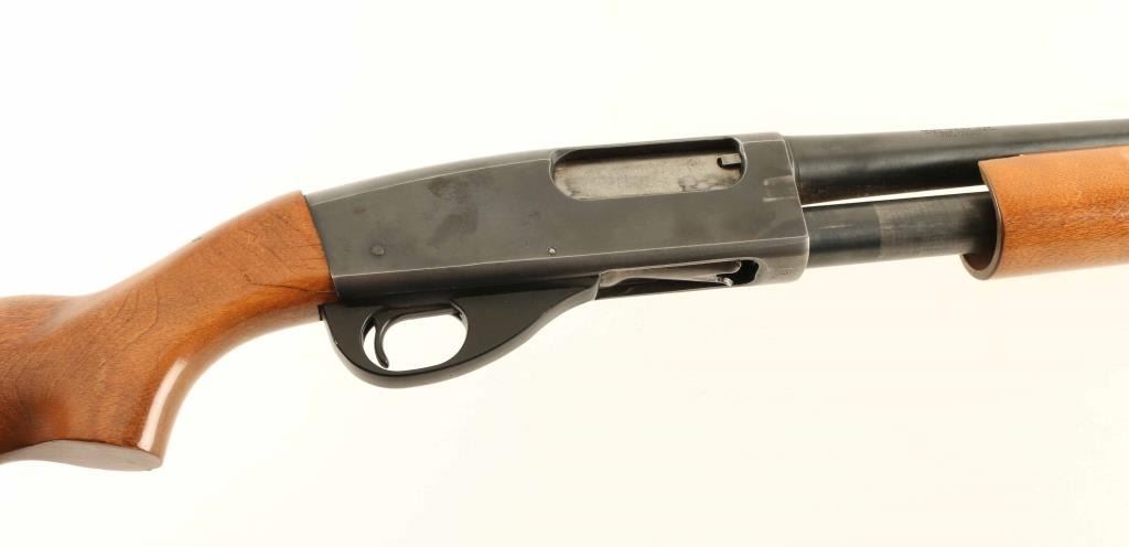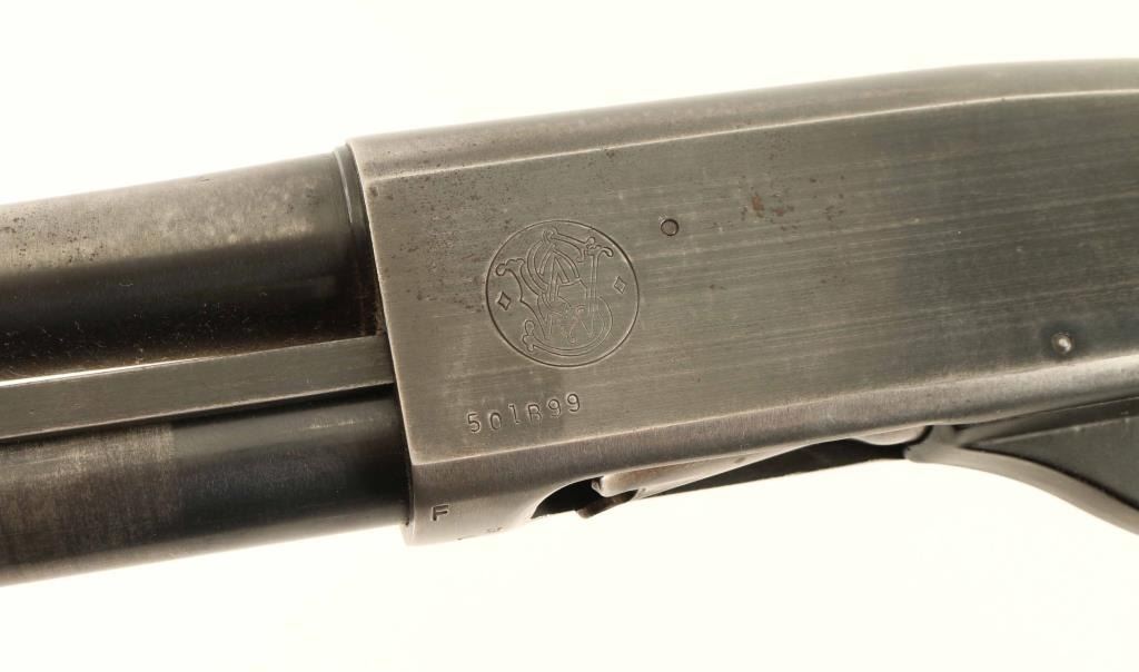 Pump action shotgun chambered for 12 gauge 3" shells. Barrel is plain, approx 30" long, brass front bead. Barrel is labeled "full choke" but muzzle gauges at "Imp Mod". Manual safety is at tang. Excellent bore; needs a normal cleaning. Retains 85% bluing with some thinning overall and several small areas forming light patina. Bare metal showing as rub spots under barrel, receiver right side, magazine tube, and on most sharp edges. "S&W" logo on receiver left is clear and crisp. Plain hardwood stock with plastic buttplate is in good condition with many small dents & scratches; some bare wood appears in small spots at wrist where finish is absent. A few small streaks of white paint on buttplate side and rear part of stock appear to be transfer from rubbing. Stock fit to receiver is fair, appears like it could be reinstalled to flush. Very good condition matching pump handle has grasping grooves. Condition is NRA Very Good ***Modern Firearm***