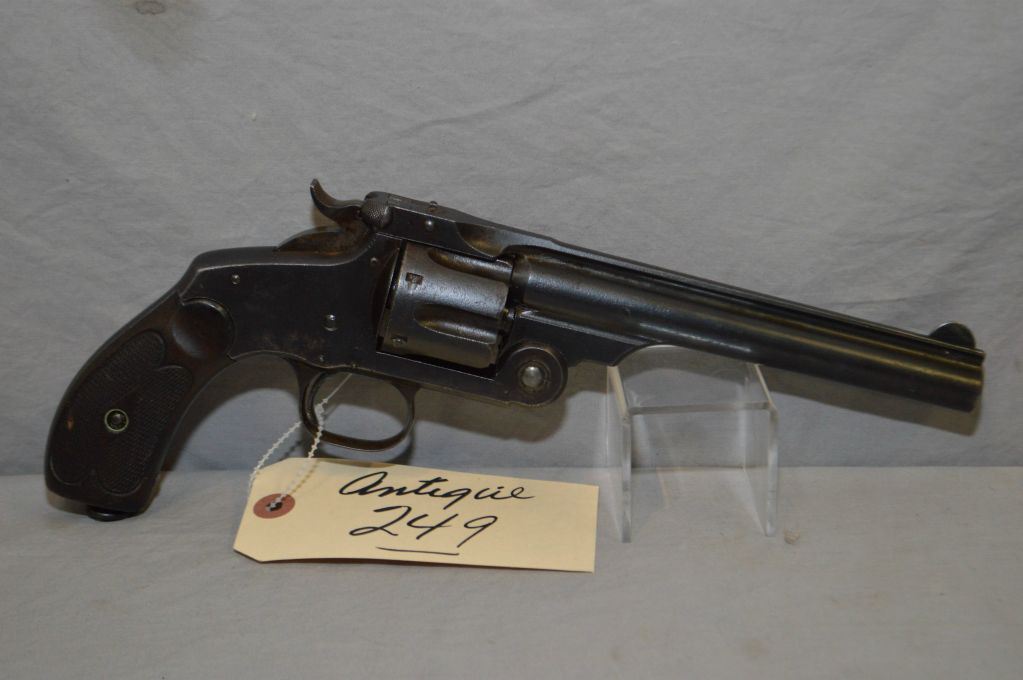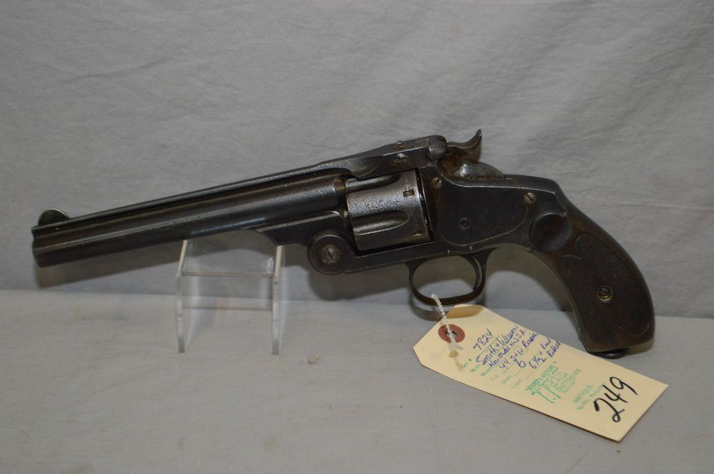 Smith & Wesson Model New Model No.3 Single Action .44 S & W Russian Cal 6 Shot Revolver w/ 6 1/2" round rib bbl [ appears to be reblued, with old pitting underneath, barrel sights, good walnut checkered grips, barrel markings "Smith & Wesson, Springfield, Mass USA Pat'd Jan.17 & 24.65. July 11.65 Aug.24.69 Apr.20.75 Feb.20 & Dec.18.1887, Reissue July 25.1871", Note : 44 Russian was a standard caliber made in limited quantities ] Ser # 7824 ANTIQUE NO PAL REQ