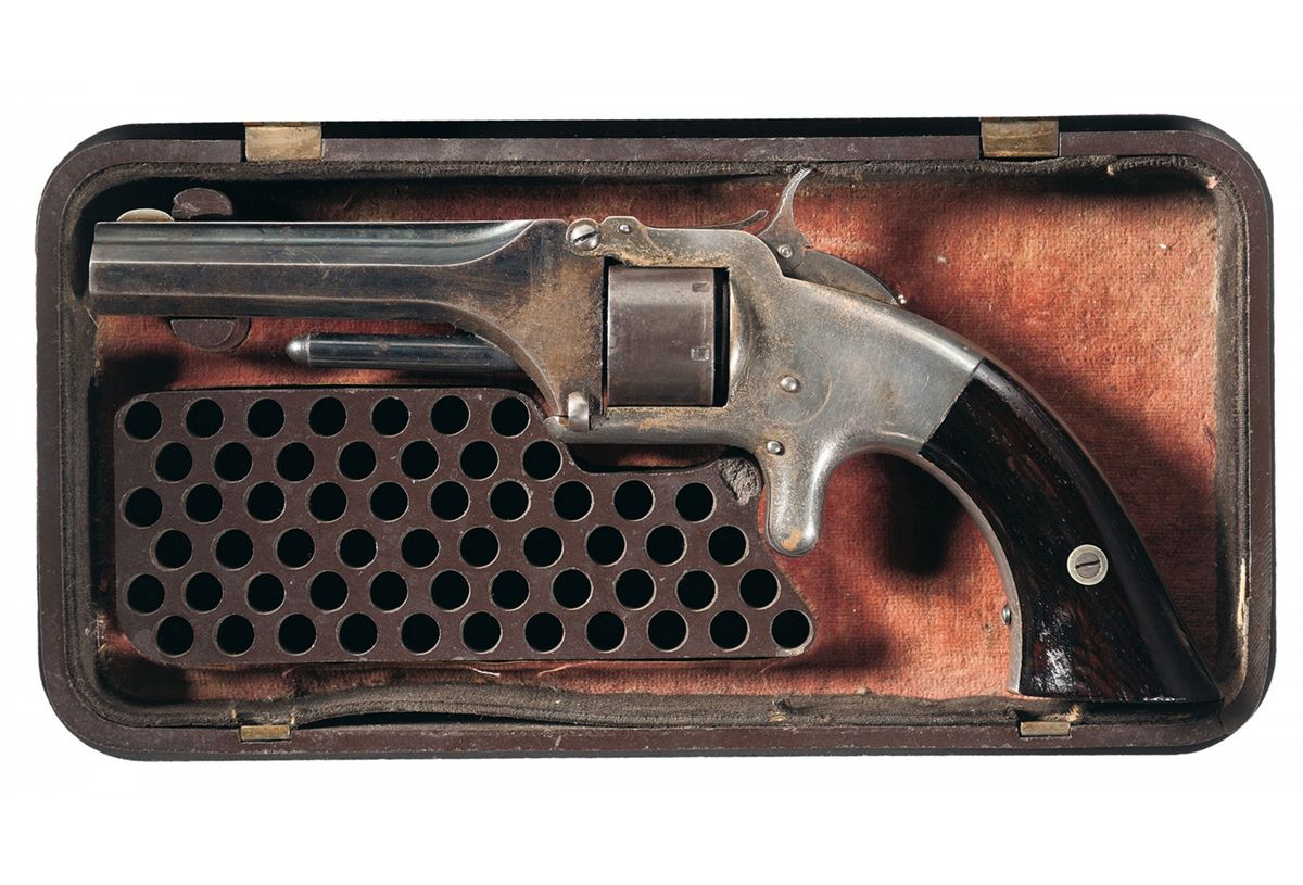 This is one of the first 100 of the Smith & Wesson Model 1 First Issue of the Third Type which saw the removal of the "bayonet latch" and the implimintation of the spring loaded barrel catch. The top of the barrel rib is stamped with the one line Springfield address and the cylinder has the patent dates marking. The barrel and cylinder are numbered to the gun. The frame is silver plated while the remaining parts are blue. Fitted with varnished rosewood grips which are numbered to the gun. Complete with an original Smith & Wesson Gutta Percha case with decorative carved lid with image of a No. 1 revolver and "MANUFACTURED ONLY BY/SMITH & WESSON,/SPRINGFIELD MASSACHUSETTS". The side of the lid has decorative wine colored velvet and there is red velvet on the bottom and 56 round bullet block.