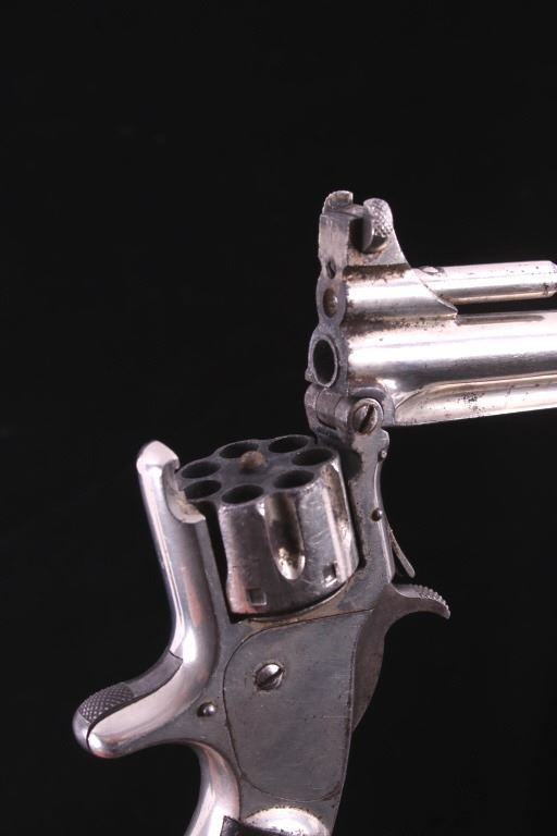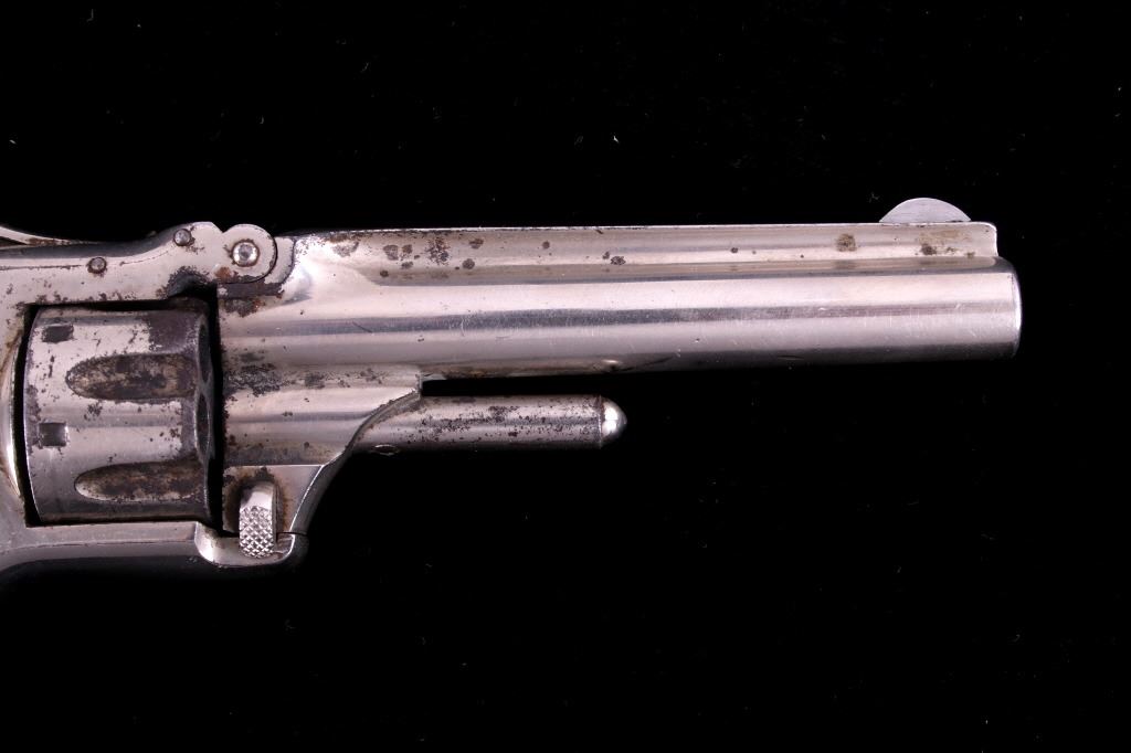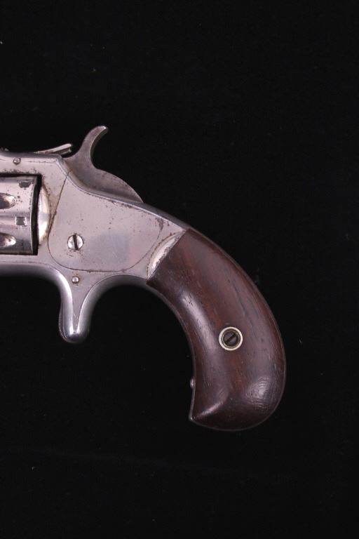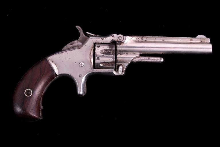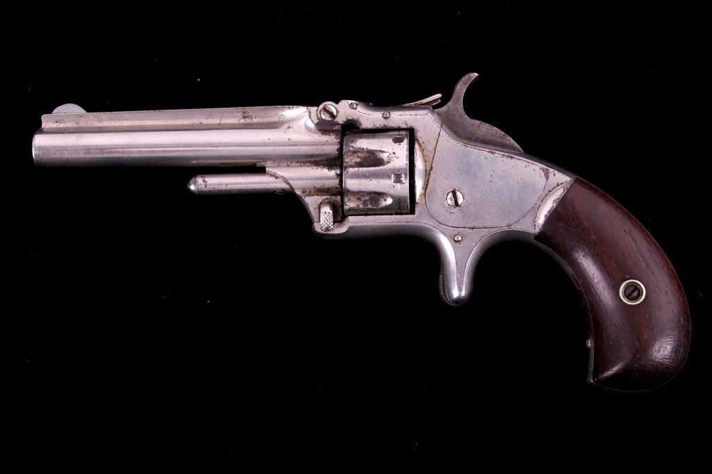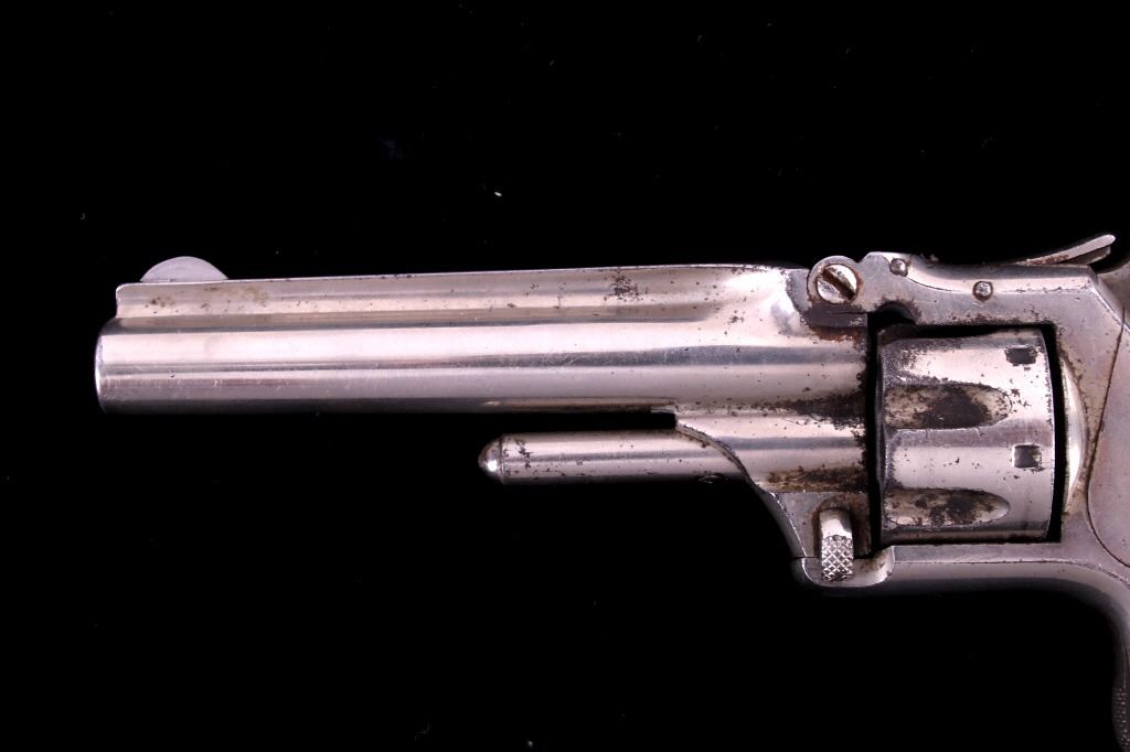 Very high condition Smith & Wesson Model No.1, Third Issue revolver, 7 shot, caliber .22 short rim fire. This was the final incarnation of the first metallic cartridge S&W revolvers that launched the company into being one of the most famous and successful firearms manufacturers of all time. This superior quality revolver was made from 1868-1881 and was a particular favorite of women or anyone needing a small, multi shot self defense weapon. This model is known as a “tip-up” revolver as the barrel tips up for loading and is secured by a hinge at the top of the barrel and frame juncture. For unloading fired cases, the barrel was tipped upward, the cylinder slid forward and free and then the stationary rod mounted under the barrel was utilized to push the empty cartridge cases free from the cylinder chambers. Loading was simple. The cylinder was easily loaded with seven cartridges, the cylinder was replaced in the frame and the barrel swung down and spring-locked in place. At this point the gun was ready to be fired. Since these were small arms and easily concealed in pockets or purses, most saw considerable carry use and surviving specimens today are usually found with much of the original finish worn off. This is a superb example in the middle serial number range for this model of 94389. It retains nearly all of the bright factory nickel finish and has beautiful factory rosewood grips that are in excellent condition showing no chips or cracks. The mechanics are also fine and even the bore is bright with sharp rifling. It retains perfect, sharp and correct barrel markings consisting of the Smith and Wesson address and patent dates ending in 1860. Overall, this early S&W is in a state of preservation seldom seen for a small pocket revolver made in the mid-1870s. The firearm qualifies as an Antique FIX, and does not require FFL Transfer or NICS Background Check. Serial Number: 94389
