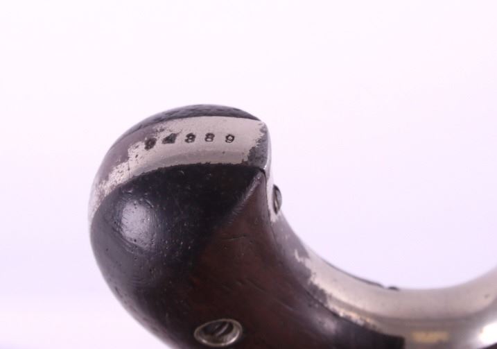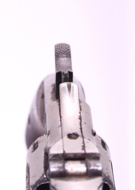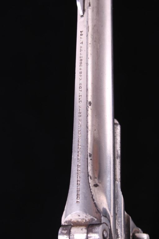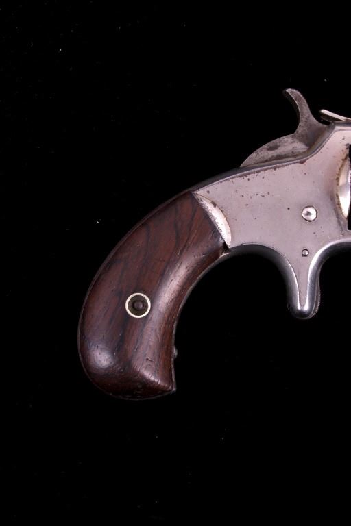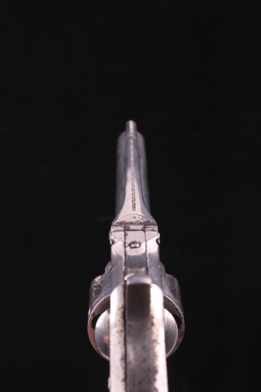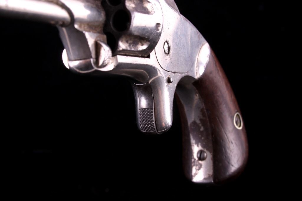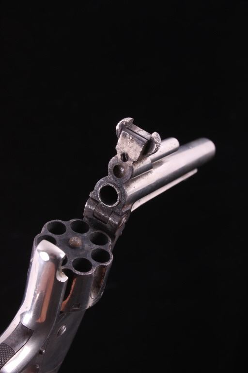 Very high condition Smith & Wesson Model No.1, Third Issue revolver, 7 shot, caliber .22 short rim fire. This was the final incarnation of the first metallic cartridge S&W revolvers that launched the company into being one of the most famous and successful firearms manufacturers of all time. This superior quality revolver was made from 1868-1881 and was a particular favorite of women or anyone needing a small, multi shot self defense weapon. This model is known as a “tip-up” revolver as the barrel tips up for loading and is secured by a hinge at the top of the barrel and frame juncture. For unloading fired cases, the barrel was tipped upward, the cylinder slid forward and free and then the stationary rod mounted under the barrel was utilized to push the empty cartridge cases free from the cylinder chambers. Loading was simple. The cylinder was easily loaded with seven cartridges, the cylinder was replaced in the frame and the barrel swung down and spring-locked in place. At this point the gun was ready to be fired. Since these were small arms and easily concealed in pockets or purses, most saw considerable carry use and surviving specimens today are usually found with much of the original finish worn off. This is a superb example in the middle serial number range for this model of 94389. It retains nearly all of the bright factory nickel finish and has beautiful factory rosewood grips that are in excellent condition showing no chips or cracks. The mechanics are also fine and even the bore is bright with sharp rifling. It retains perfect, sharp and correct barrel markings consisting of the Smith and Wesson address and patent dates ending in 1860. Overall, this early S&W is in a state of preservation seldom seen for a small pocket revolver made in the mid-1870s. The firearm qualifies as an Antique FIX, and does not require FFL Transfer or NICS Background Check. Serial Number: 94389