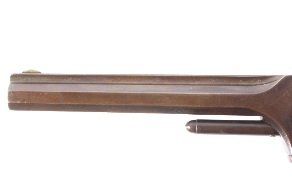 You are bidding on a Smith & Wesson Model No.2 Old Model Army .32 Rimfire Revolver. This was S&Ws first revolver over .22 caliber that was made from 1861-1874. Those with serial numbers below 35731 were manufactured before the end of the Civil War. This excellent example has low serial number 13579 and was manufactured during the very early years of the war. As described in Flayderman’s Guide to Antique American Firearms: “The Model No.2 was a popular personal sidearm with many officers and enlisted men during the Civil War. General George Armstrong Custer is known to have owned a pair of these…The notorious western gunslinger ‘Wild Bill’ Hickock, while marshal of Deadwood was carrying a Model 2 “Army” (as well as aces and eights) the night he was shot in August 1874.” .” This example is in a much higher grade of condition to those usually encountered, most of which show hard use and often abuse. Even the bore is in superior condition, exc. mechanically with very slight wobble barrel to frame hinge. (most of these are worn and loose), correct “SMITH & WESSON SPRINGFIELD, MASS.” Barrel marking with correct tiny patent date markings around the cylinder and matching assembly numbers on the frame and barrel. This especially early .32 caliber revolver is a particularly fine example with 6” barrel, lovely matching serial number rosewood grips and totally uncleaned, natural patinaed plum surface appearance. This is revolver was manufactured from 1861-1874. Antique firearm. NO FFL transfer or NICS background check required. Serial number is 13579.