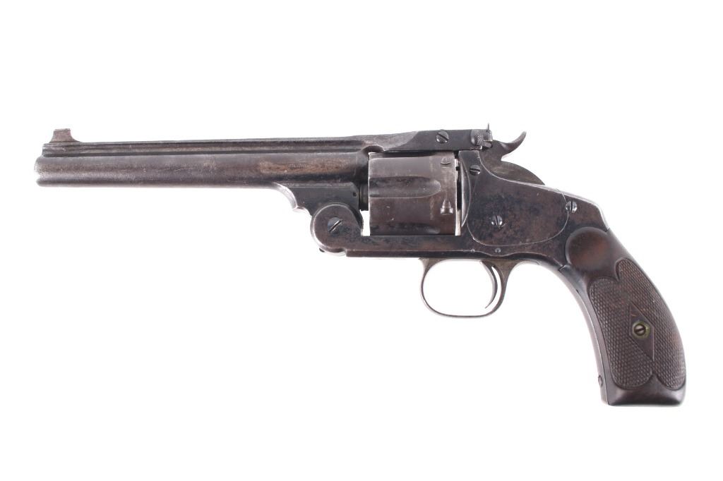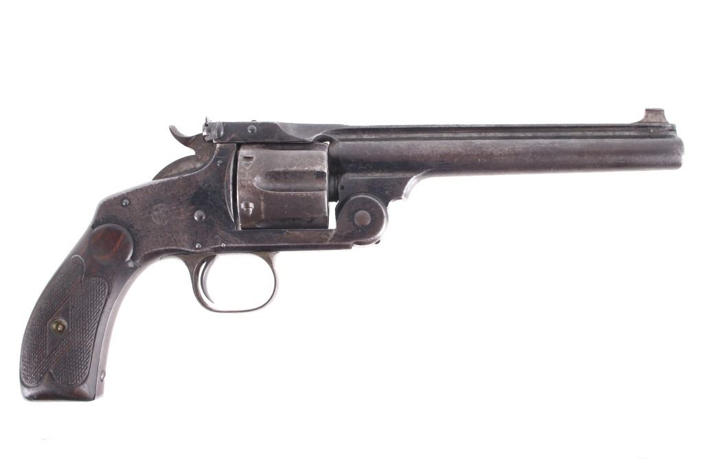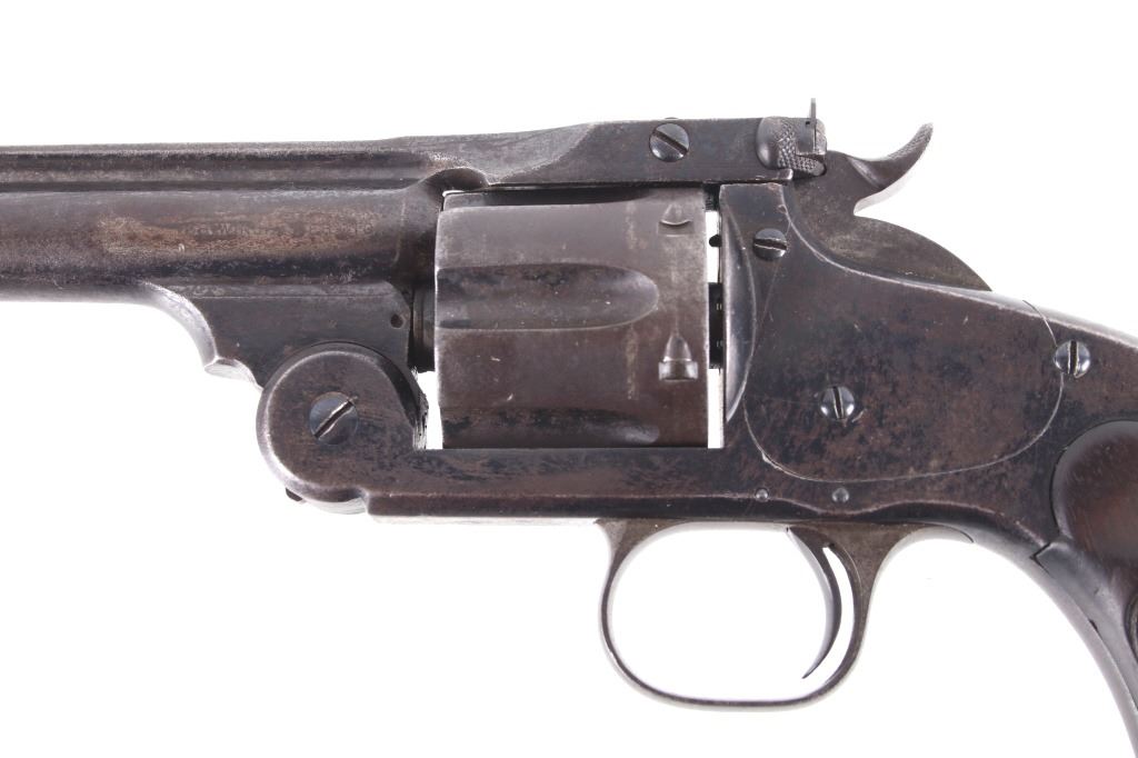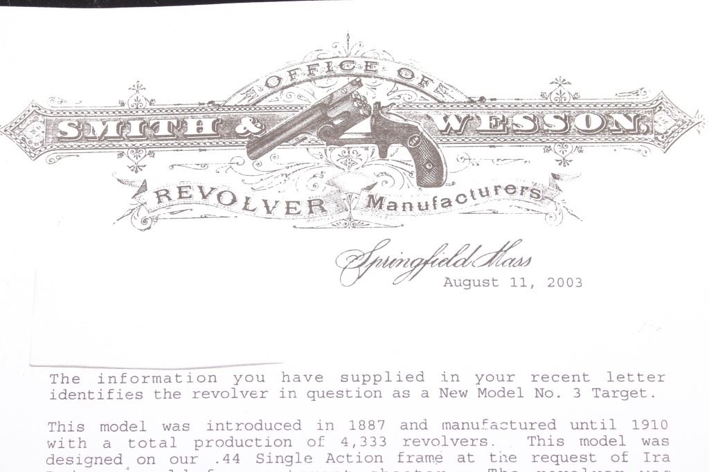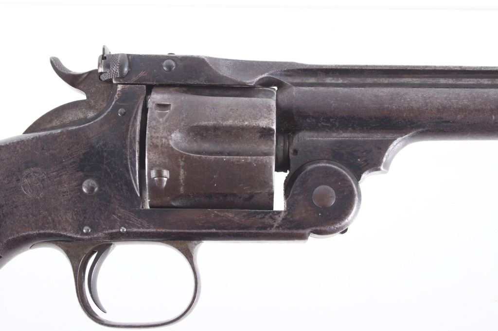 This is truly a rare Dr. Roy Jinks factory lettered Smith & Wesson Model No. 3 Target Revolver chambered in .38-40 Winchester CTG, noted as being possibly as low as 15 ever made by Dr. Jinks. Matching numbers on butte, cylinder and inside barrel when breach is opened. This model was introduced in 1887 and in production until 1910 with over 4,000 pistols produced. While these revolvers were offered from 1900 – 1907, all frames were made pre-1899 and are therefore antique and can be purchased without an FFL or C&R license. While many New Model No. 3's were produced, Target models were rare and only around 50 or so were chambered in .38 caliber making this a rare find. The revolver displays a 6 1/2" long ribbed barrel, six shot cylinder, single action hammer and trigger, and hardwood grips. This piece shows the longer barrel of a target version. The left side of the barrel is marked reading "38 WINCHESTER CTG" with the top of the barrel rib in faded lettering with patent dates and Smith & Wesson address. Mechanically the revolver still shows working order with a smooth rotation and crisp trigger. The piece shows good condition overall with some of the original blue'd finish and warm patina across the rest of the revolver. The pistol comes with a Smith & Wesson Manufacturers letter with information on the revolver and records of its early history. The revolver weighs 2lbs 6oz. Serial Number: 4071. This firearm qualifies as an Antique, and does not require FFL Transfer or NICS Background Check.