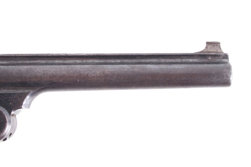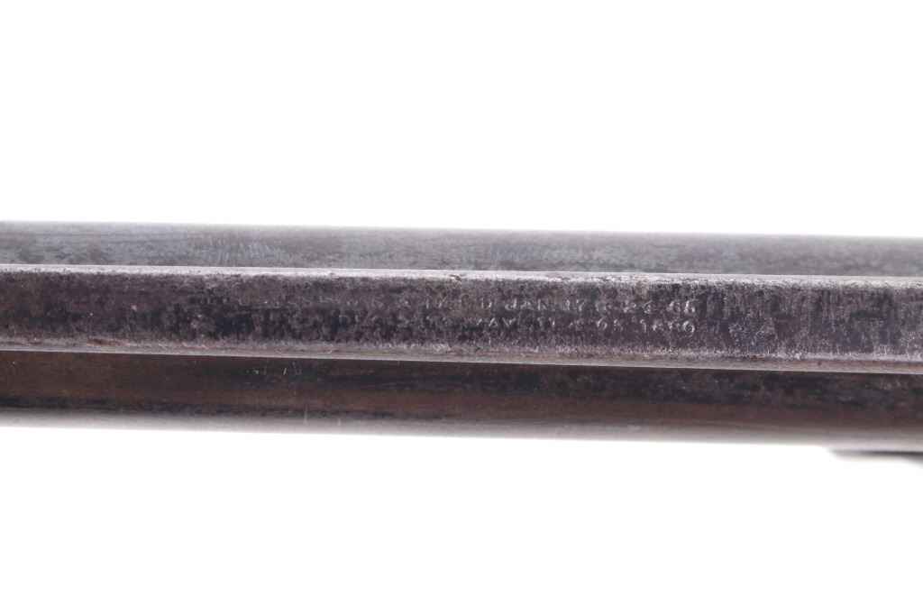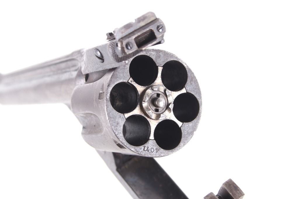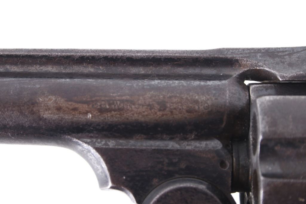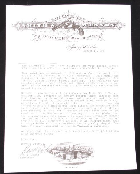 This is truly a rare Dr. Roy Jinks factory lettered Smith & Wesson Model No. 3 Target Revolver chambered in .38-40 Winchester CTG, noted as being possibly as low as 15 ever made by Dr. Jinks. Matching numbers on butte, cylinder and inside barrel when breach is opened. This model was introduced in 1887 and in production until 1910 with over 4,000 pistols produced. While these revolvers were offered from 1900 – 1907, all frames were made pre-1899 and are therefore antique and can be purchased without an FFL or C&R license. While many New Model No. 3's were produced, Target models were rare and only around 50 or so were chambered in .38 caliber making this a rare find. The revolver displays a 6 1/2" long ribbed barrel, six shot cylinder, single action hammer and trigger, and hardwood grips. This piece shows the longer barrel of a target version. The left side of the barrel is marked reading "38 WINCHESTER CTG" with the top of the barrel rib in faded lettering with patent dates and Smith & Wesson address. Mechanically the revolver still shows working order with a smooth rotation and crisp trigger. The piece shows good condition overall with some of the original blue'd finish and warm patina across the rest of the revolver. The pistol comes with a Smith & Wesson Manufacturers letter with information on the revolver and records of its early history. The revolver weighs 2lbs 6oz. Serial Number: 4071. This firearm qualifies as an Antique, and does not require FFL Transfer or NICS Background Check.