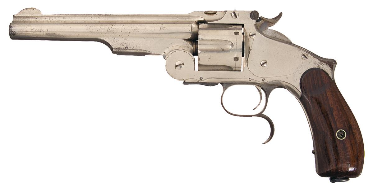 Manufactured from 1874 to 1878. The top of the barrel rib is marked "SMITH & WESSON SPRINGFIELD MASS. U.S.A. PAT" with the remainder ground off. The butt frame is marked with "SH" in a diamond over the serial number and there is a lanyard ring mounted on the butt. The rear face of the cylinder and top strap at the latch are marked "667". "39971" is stamped on the inside of the right grip panel. The front sight is integral to the barrel rib and the extraction housing is shorter which is characteristic of the 3rd Model Russian. Fitted with smooth two piece oiled walnut grips.