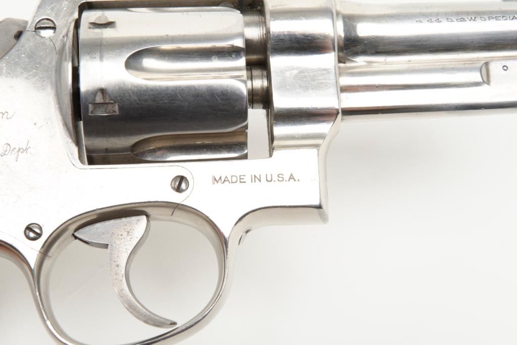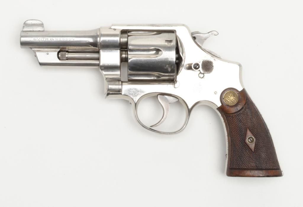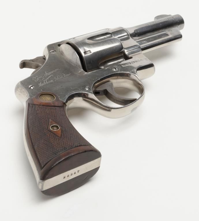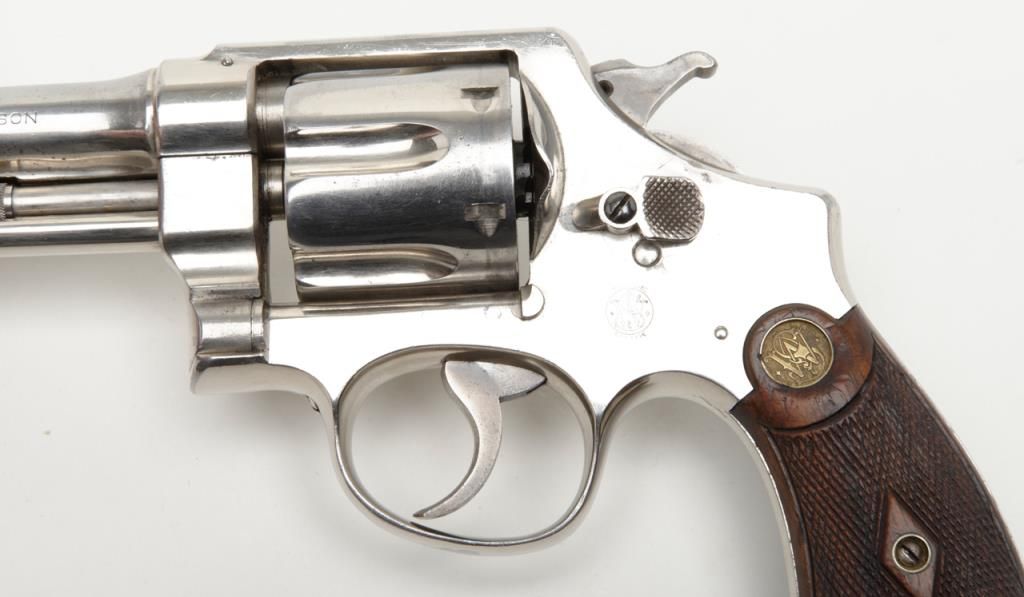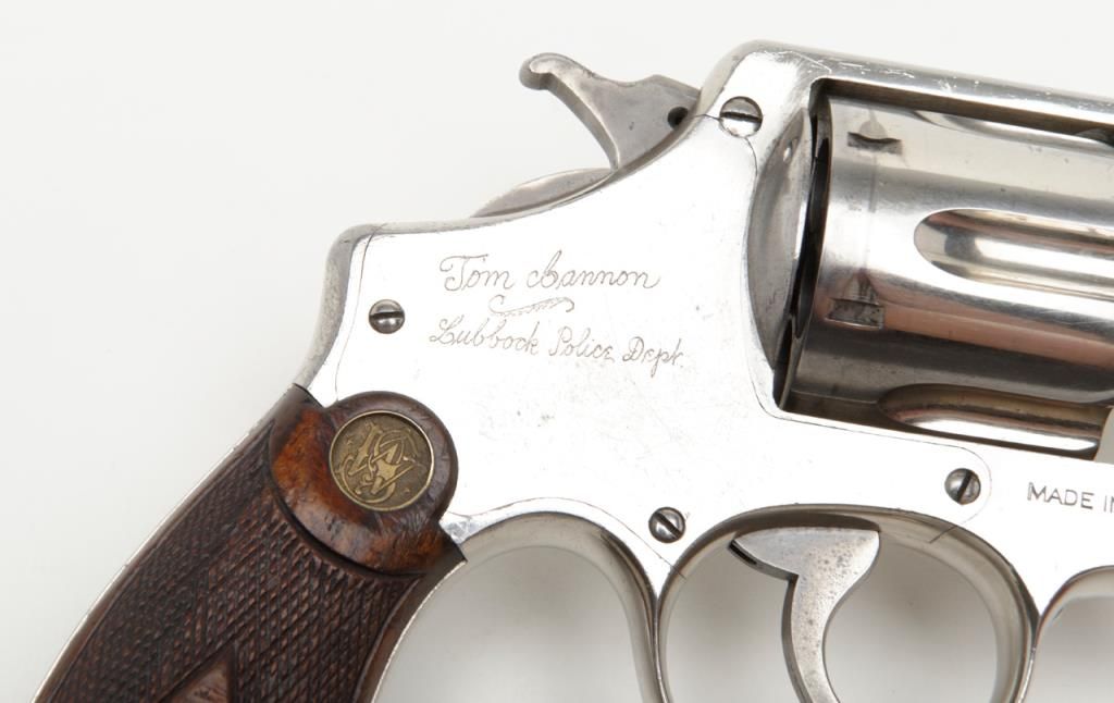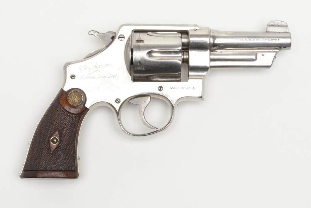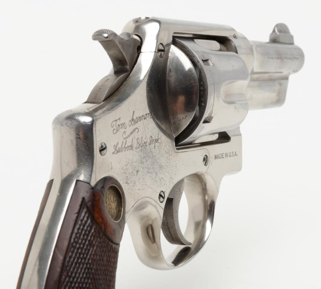 Smith & Wesson Model of 1926 DA revolver, .44 Special cal., barrel reduced to 3-1/2”, nickel finish, checkered gold medallion wood grips, #28827 (matching barrel and cylinder); right side plate inscribed “Tom Cannon, Lubbock PoliceDept.”. This gun is in overall very good to near fine condition showing a professional job of shortening the barrel, majority of original nickel finish remaining; very good bore, crisp action, very good markings and grips. This Model wassimilar to the famous S&W triple lock (First Model .44 H.E.) but without the third locking point; it was manufactured between 1926 and 1949. Officer Cannon should be further researched as to his years of service and assignments. (C&R). Est.: $1,000-$2,000