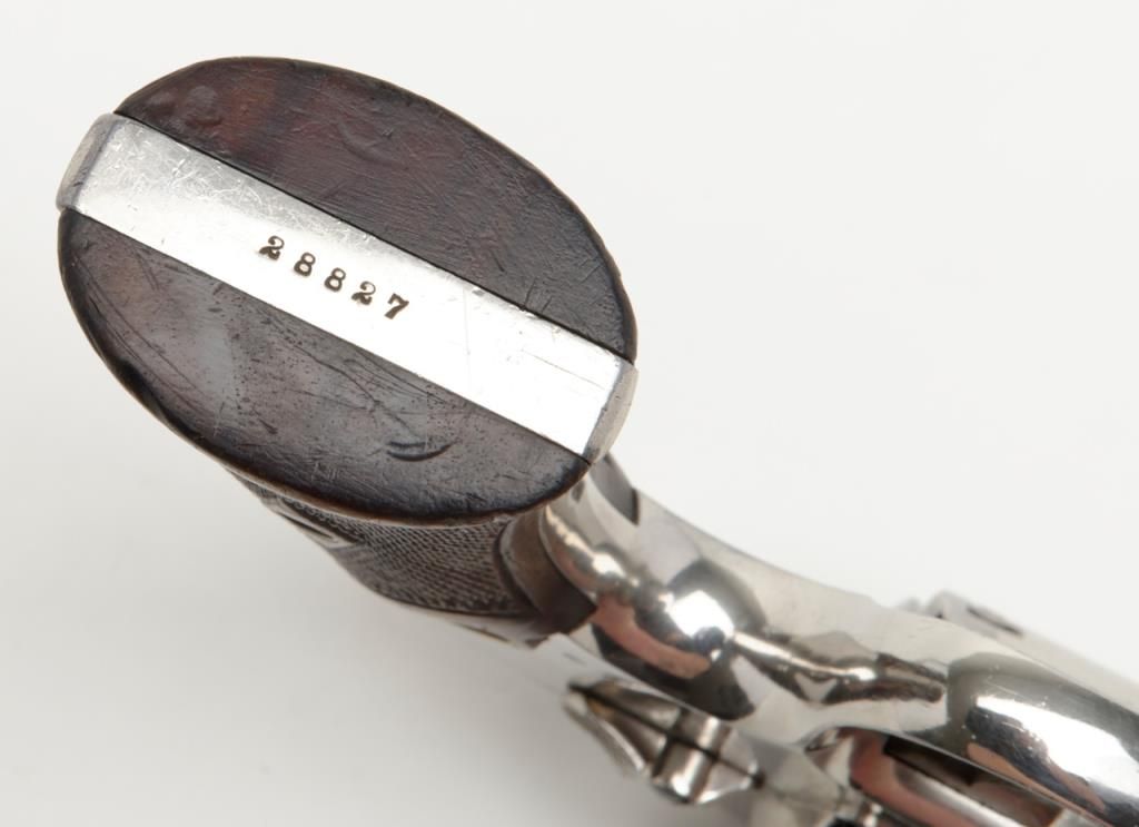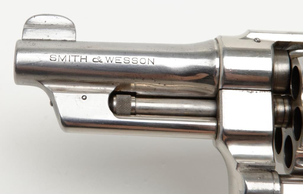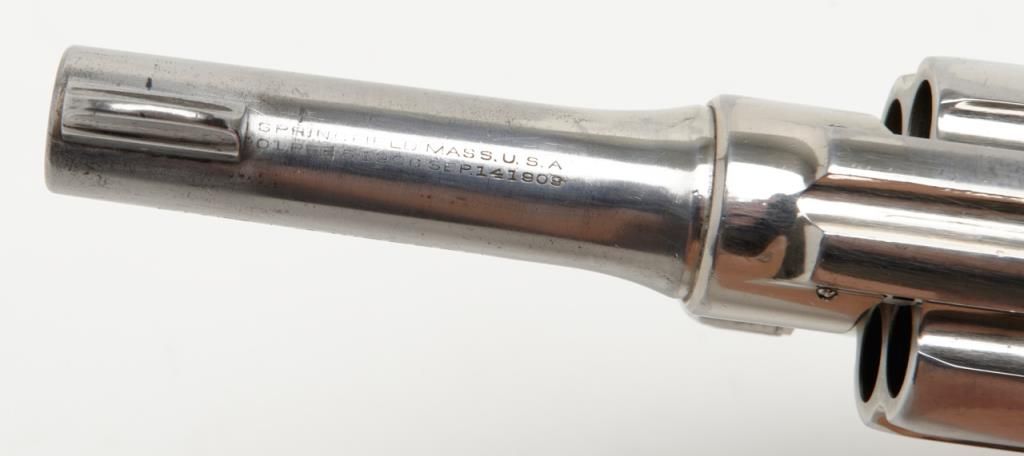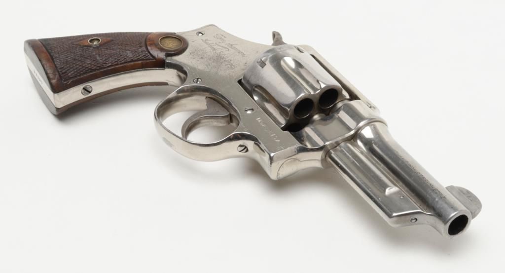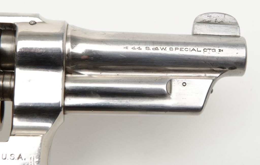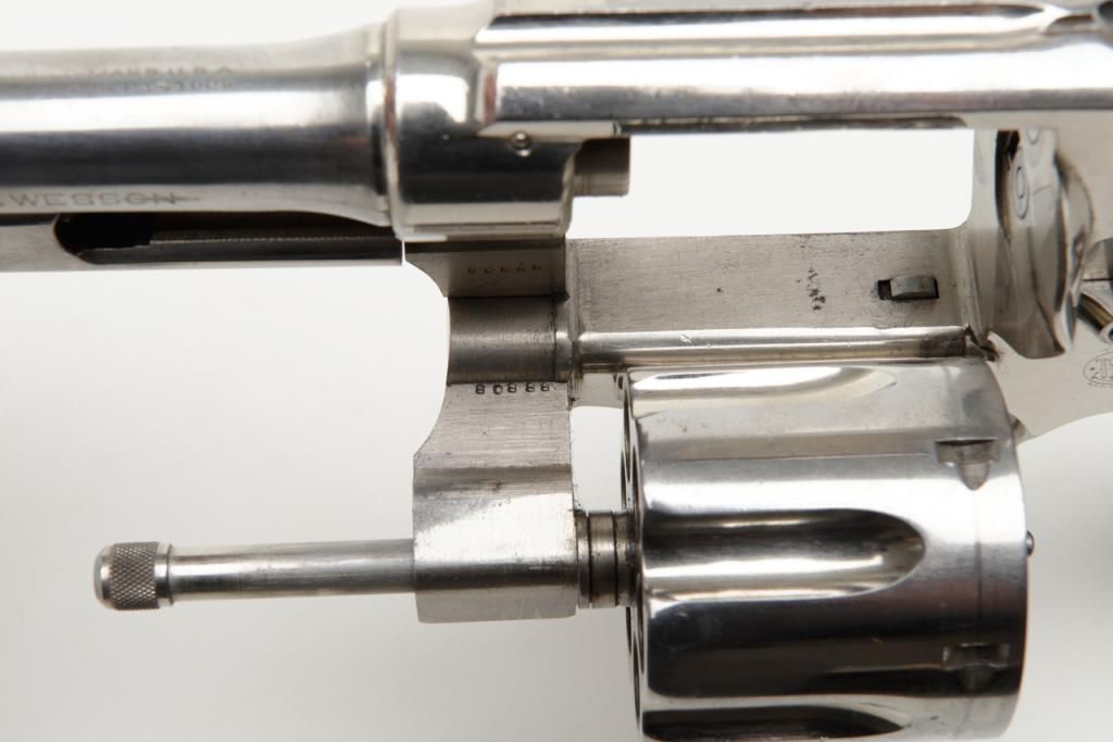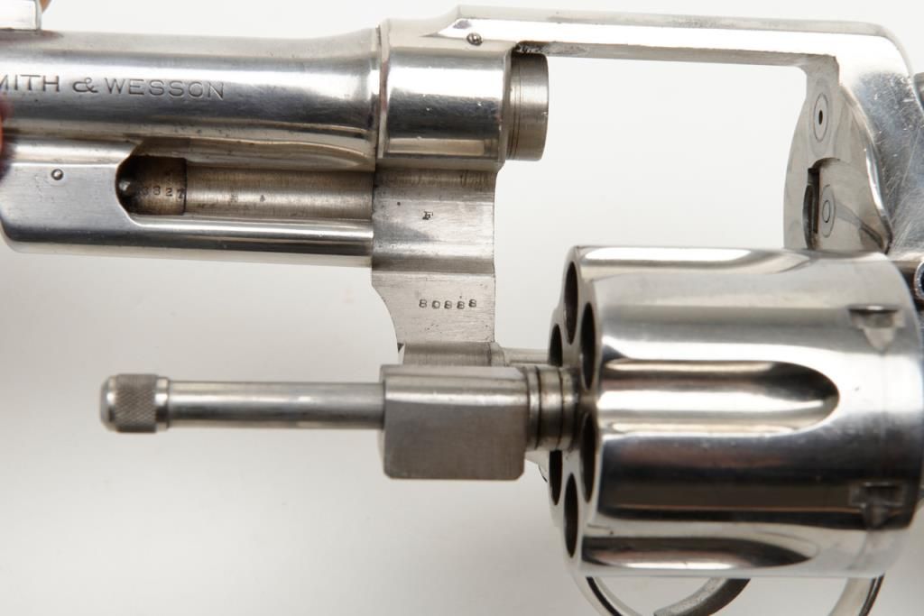 Smith & Wesson Model of 1926 DA revolver, .44 Special cal., barrel reduced to 3-1/2”, nickel finish, checkered gold medallion wood grips, #28827 (matching barrel and cylinder); right side plate inscribed “Tom Cannon, Lubbock PoliceDept.”. This gun is in overall very good to near fine condition showing a professional job of shortening the barrel, majority of original nickel finish remaining; very good bore, crisp action, very good markings and grips. This Model wassimilar to the famous S&W triple lock (First Model .44 H.E.) but without the third locking point; it was manufactured between 1926 and 1949. Officer Cannon should be further researched as to his years of service and assignments. (C&R). Est.: $1,000-$2,000