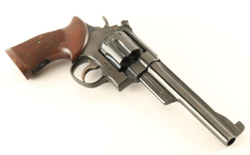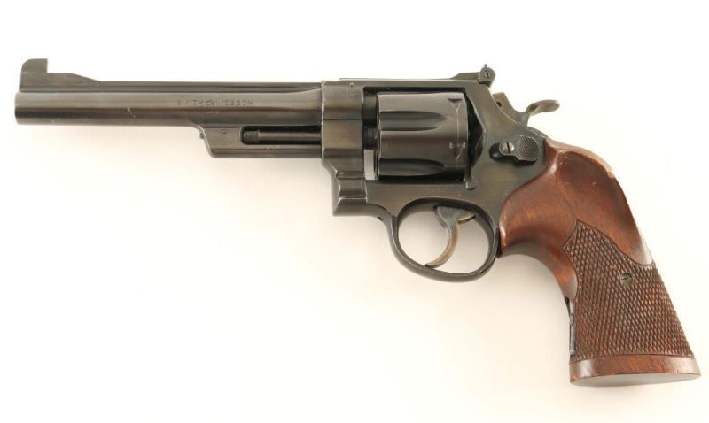 SN: S126128 'Pre-Model 26' Vintage large frame double-action revolver chambered in .45 Automatic, circa 1950-1961. Features a blued finish, pinned 6" barrel with serrated rib, 1/8" patridge front sight, adjustable micrometer click rear sight, fluted six-shot cylinder, shrouded ejector rod, .265" serrated trigger, .500" target hammer, square butt N target frame with six groove grip straps, and custom two-piece checkered walnut target grips with thumb rest on the left panel. Serial numbers match on the frame, barrel, cylinder and extractor. Revolver retains approximately 90% of it's original finish showing bright scratches/nicks, a couple dots of surface rust on the cylinder & front sight and a large spot of heavy rust on the hammer spur. Action is smooth with solid lock-up, bore is pristine, and the wood grips are good+ with scratches & small losses. Condition is NRA very good+. ***C&R Firearm***