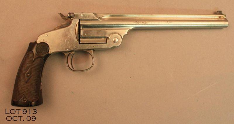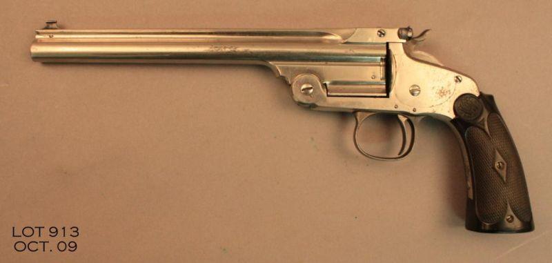 Smith & Wesson Model of ’91 single shot pistol, target sights, 8” barrel, nickel finish, checkered black hard rubber extended grips, #8039. This gun is in overall very good condition showing approx. 90% original finish, very good bore, action,markings and good grips. Frame shows recoil shield. Est.: $400-$800.
