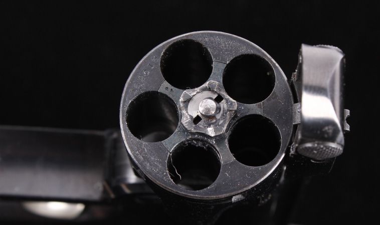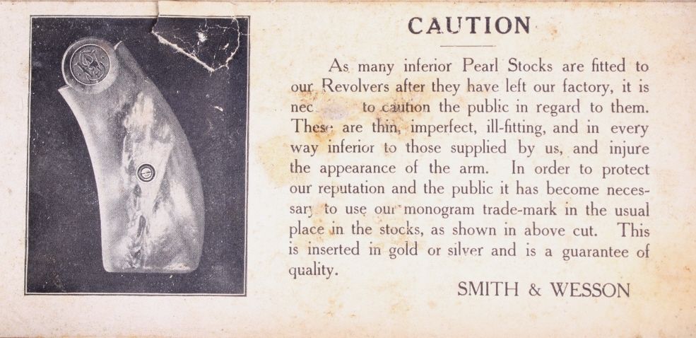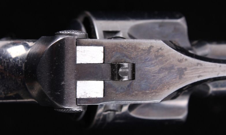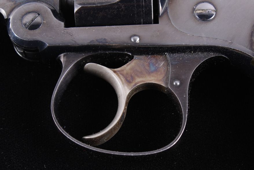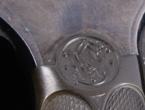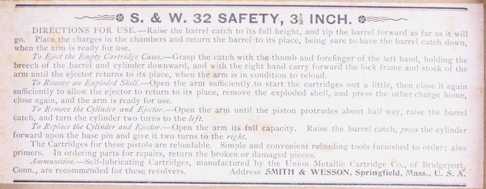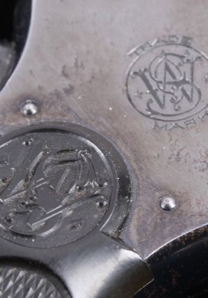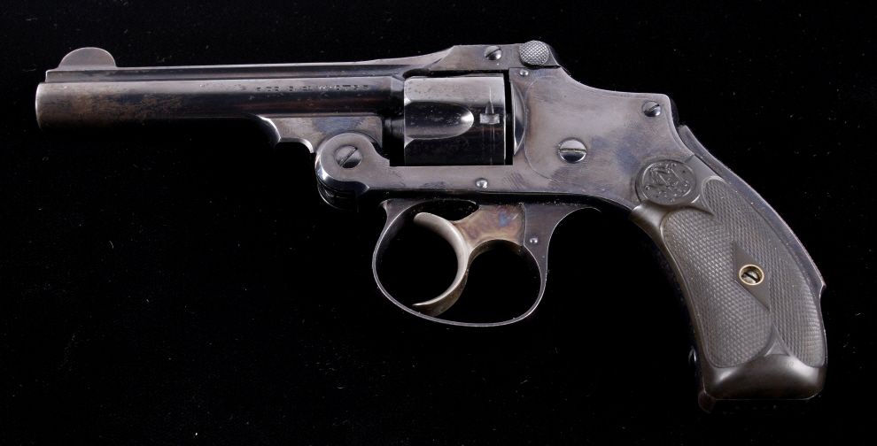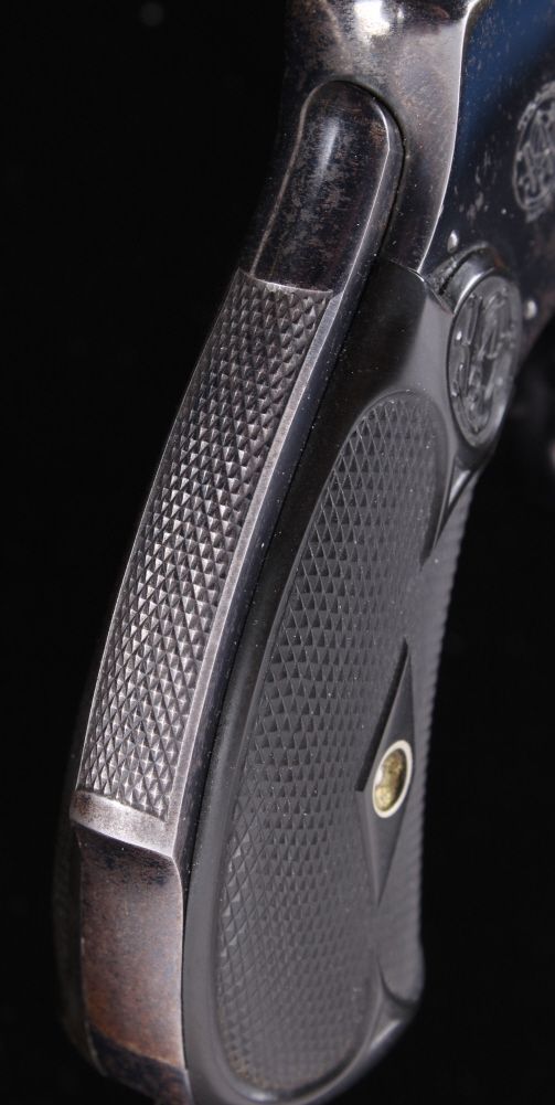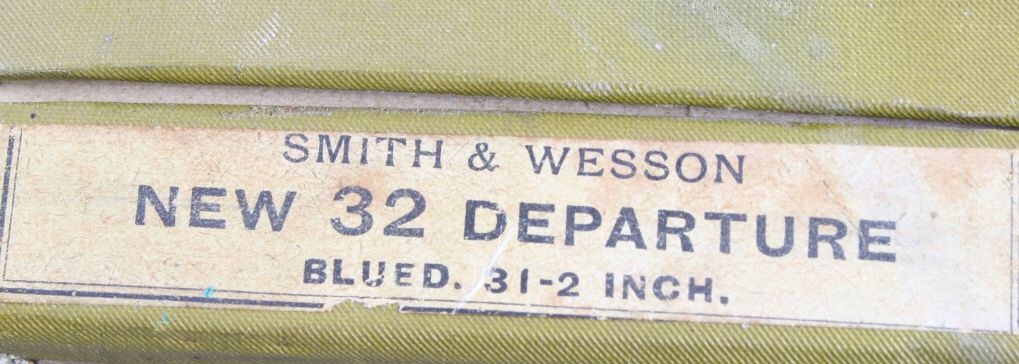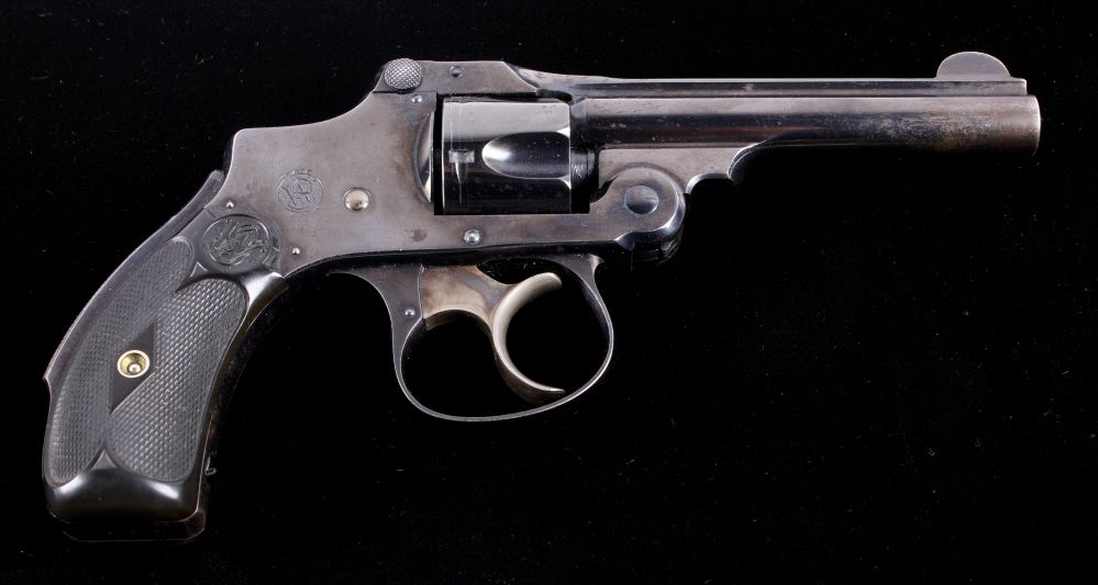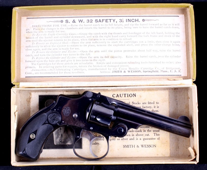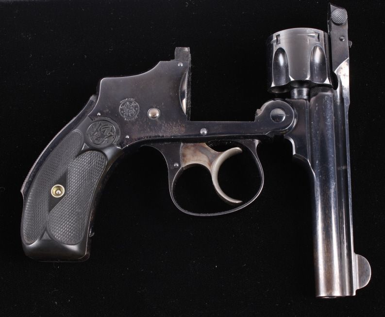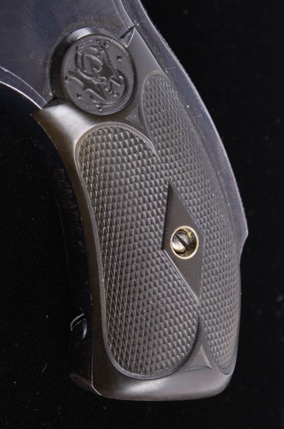The Smith & Wesson Lemon Squeezer New Departure or the "Safety Hammerless" is a double action revolver that was produced in the late 1880s by Smith & Wesson. In the original box. This is a .32 S & W caliber five shot break over double action revolver with the original grips. The gun shows almost all of the original finish. This is a First Model New Departure and was manufactured early 1900's (believed). This is called the Lemon Squeezer as the revolutionary shoots when the grip is squeezed. Break over cylinder with shell ejector.