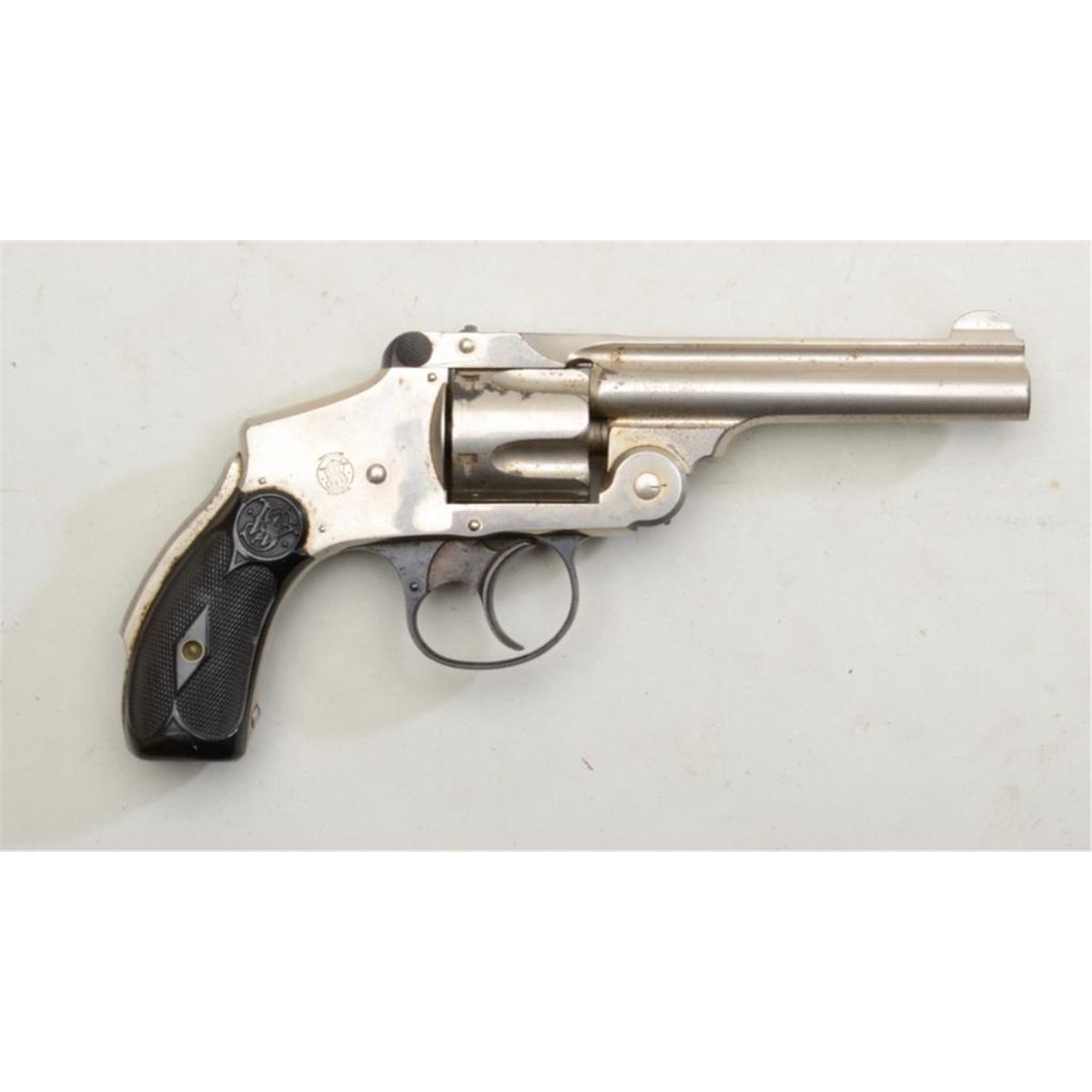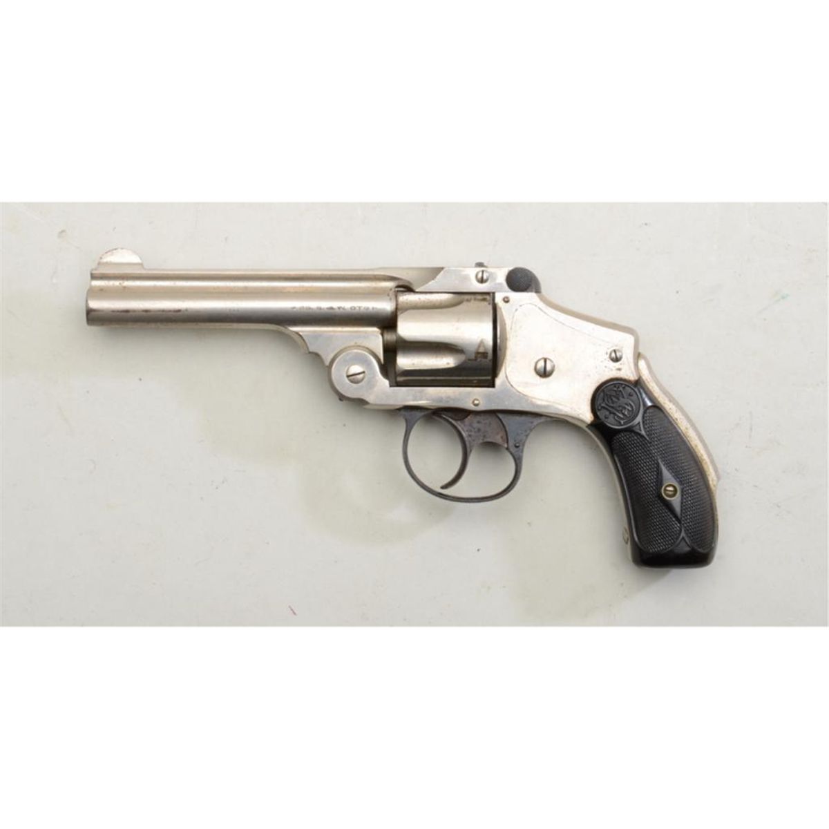Smith & Wesson New Departure concealed hammer DA revolver, .38 cal., 4” barrel, nickel finish, checkered black hard rubber grips, #214722. This gun is in overall excellent condition showing approx. 95% original frosty nickel finish with fine action, bore, markings and grips. Est.: $150-$250.