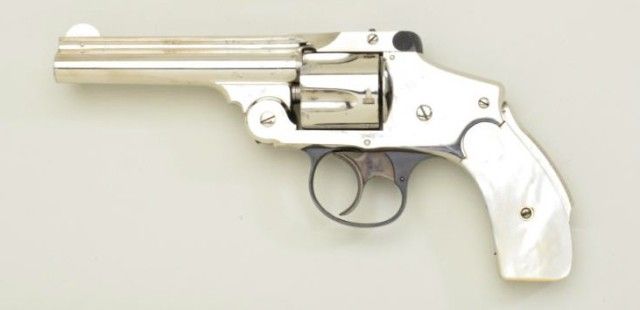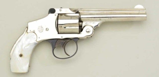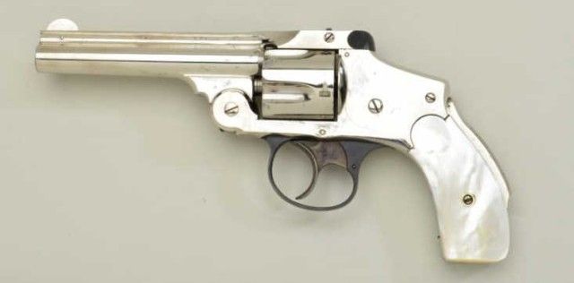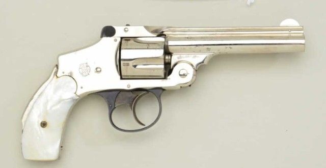 Smith & Wesson “New Departure” or lemon squeezer 38 cal DA revolver, nickel plated, pearl grips in fine to excellent original cond. Serial #136575. The revolver shows 95-98% plus original nickel, some justbeginning normal age and slight loss. There is a tiny amount of pinprick spotting. The grips are fine to excellent. The trigger guard shows 95% plus original blue as does the latch. The trigger shows 80-90% colorful case hardening. The action tight, the bore bright but needs cleaning. A 9.5 on 1-10 scale. Est.;$1,000-$2,000.