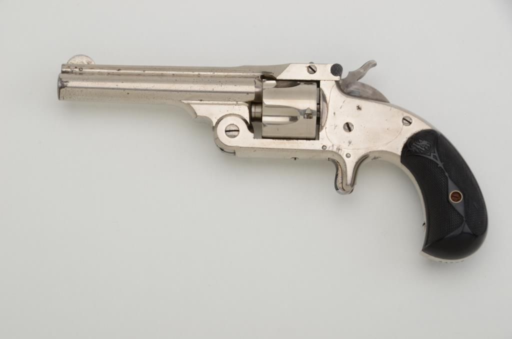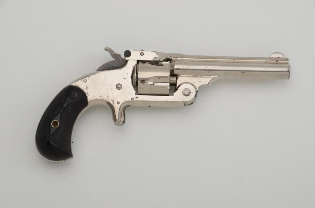 Smith & Wesson New Model 1-1/2 spur trigger revolver, .32 cal., 3-1/2” barrel, nickel finish, checkered hard rubber grips, #62979. This gun is in overall fine to excellent condition showing approx. 95%+ originalfinish, fine bore, action, markings and grips. Est.: $200-$300.
