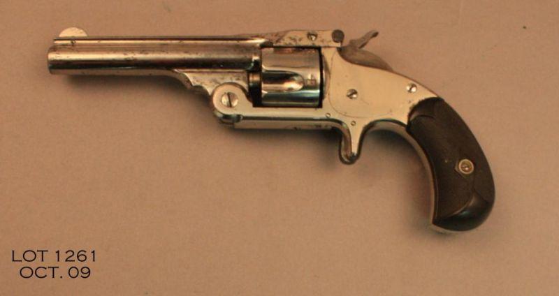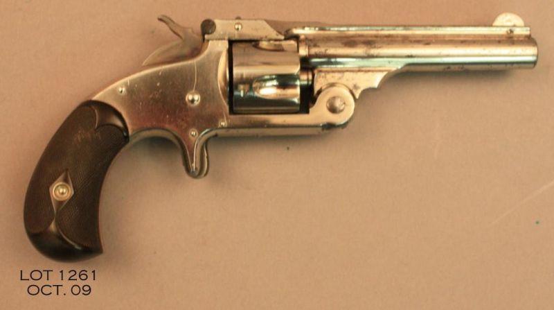 Smith & Wesson New Model 1-1/2 spur trigger revolver, .32 cal., 3-1/2” barrel, nickel finish, checkered hard rubber black grips, #4420. This gun is in overall very good condition showing apporx. 85% polished original finish, good bore, action,markings, and grips. Est.: $200-$400.