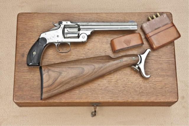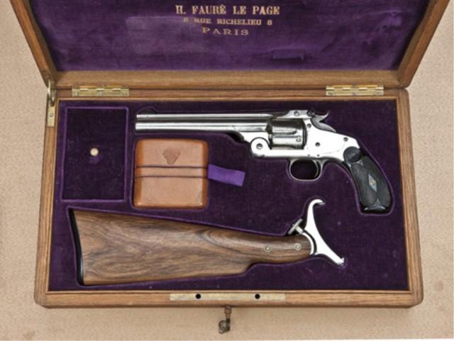 Smith & Wesson New Model #3 Target single-action revolver, .32-44 caliber, nickel plated, target sights, factory cut for shoulder stock, serial 2489, in French style deluxe fitted case, with shoulder stock, leather cigar style cartridge carrier, and box of .32-44 target caliber cartridges by UMC contained in the compartment. The interior of the case shows gold embossed maker’s label. H. Faure, LePage, 8. Rue Richelieu. 8. Paris. The French were known to favor the S&W for target purposes and LePage was a dealer in all types of arms. The Smith & Wesson shows factory offset serial number on butt, and factory mills slot and groove in backstrap for shoulder stock. The pistol is fitted with target front and rear sights, and the revolver retains 85-95% original nickel, drifting at the edges of cylinder and muzzle, with some slight erosion and pinprick pitting where nickel has lifted or flaked. The barrel address is good and the edge of the rib shows a couple of nicks. The action is good, the bore is very good plus. The hammer shows 50-60% case hardening, the trigger guard has drifted to grey. The ejector and spring show some original blue, as does the front sight. The pistol is