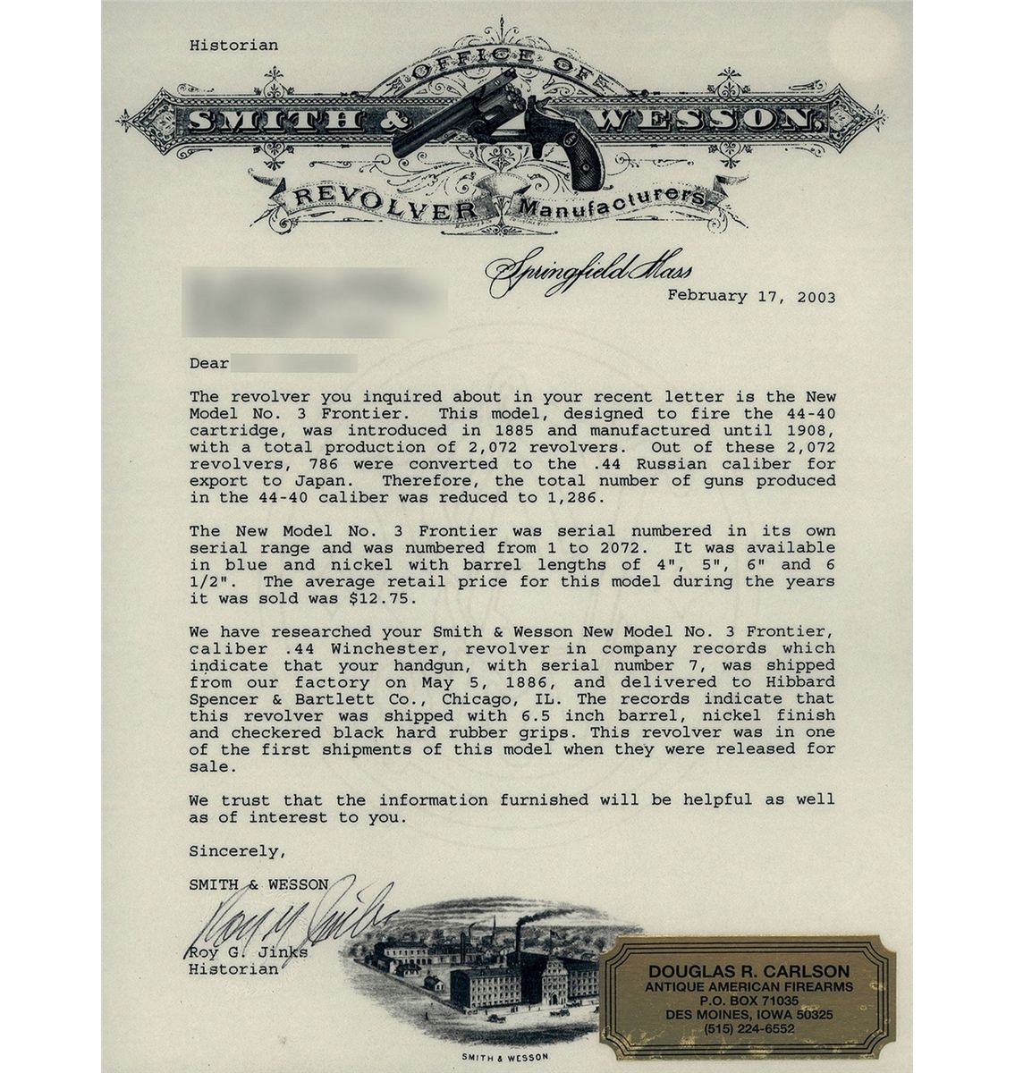 This documented serial number 7 New Model No. 3 Frontier revolver is one of 1,286 out of the 2,072 revolvers manufactured that remained chambered for 44-40 caliber and was in one of the first shipments of this model when it was released for sale as confirmed by the included factory letter. The factory letter also confirms the caliber, barrel, finish and checkered hard rubber grips. The revolver was shipped on May 5, 1886 to Hibbard Spencer & Bartlett Co. of Chicago, Illinois. These revolvers sold for an original average price of $12.75. The top of the barrel rib is stamped with the two line address/patent dates marking. Pinned blade front sight and notch rear sight on the barrel latch. The rare single digit serial number is stamped on the butt, rear cylinder face, barrel and barrel latch. The revolver has checkered S&W monogram grips with the right panel numbered to the gun.