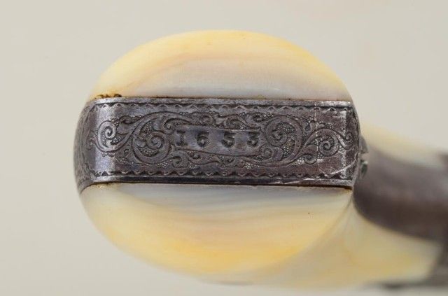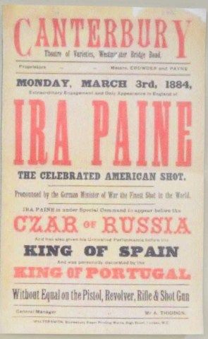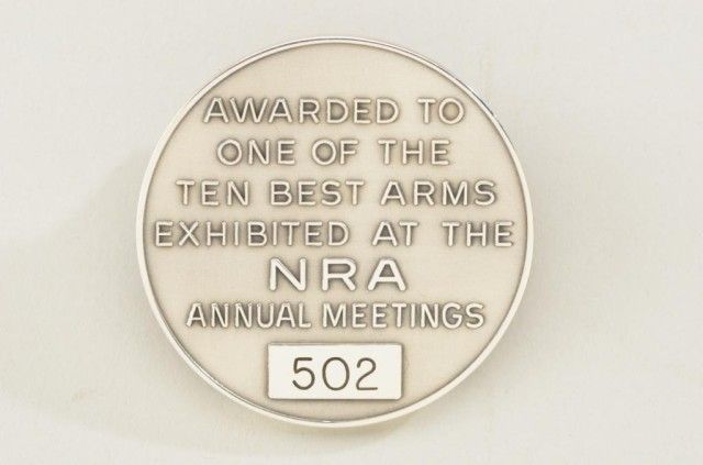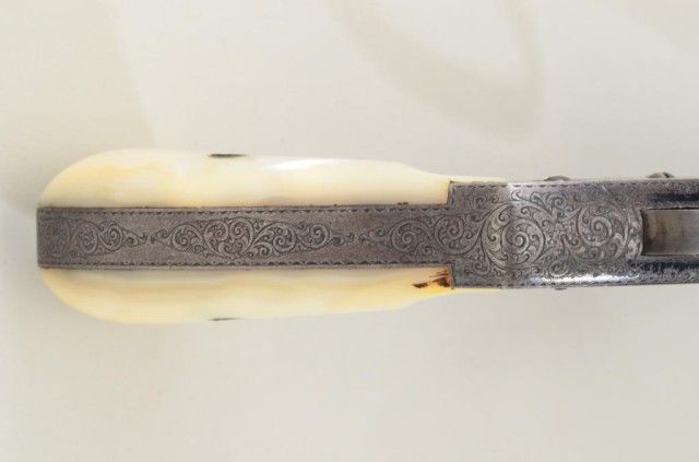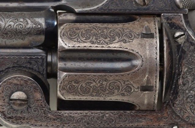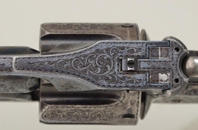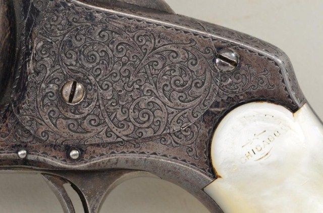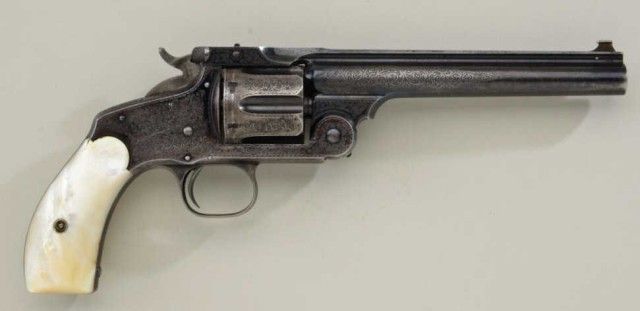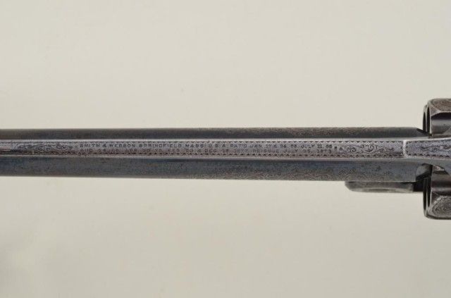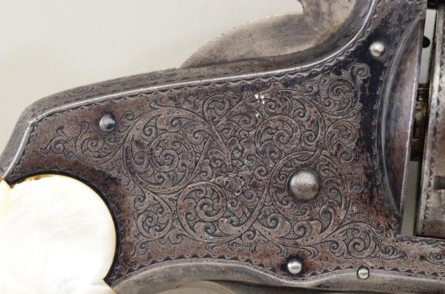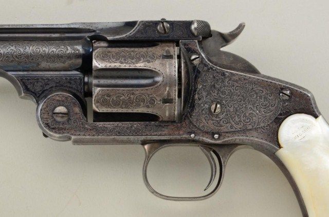 Smith & Wesson New Model No. 3 Frontier target model revolver 44-40 cal factory special ordered exhibition engraved by Gustav Young, blued finish, pearl grips shipped Feb. 17th 1887 and delivered to Ira Paine,Providence, R.I. Serial #1653 originally one of a pair, its mate numbered 1654. Ira Paine was a champion shooter who shot at exhibitions and held many records and titles. In a book entitled “Bullet Holes” published by S & W in 1915 Douglas Wesson explained that Paine introduced revolver shooting to his show and exhibition program while in Europe in 1881. Paine consulted with Gastine Renette and after exhaustive tests theysettled on the S & W New Model No. 3 as their ultimate choice for an accurate revolver. Paine traveled thru out Europe and used S & W in exhibitions of trick shooting which so impressed the King of Portugal he wasknighted as a Chevalier of an ancient Military order. He performed for the Czar of Russia, King of Spain and large audiences similar to Buffalo Bill and Anne Oakley who were performing in Europe at the same time.