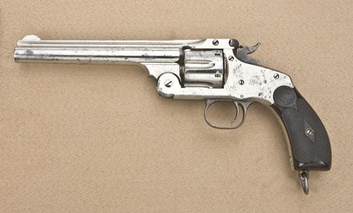 Smith & Wesson New Model No. 3 Single Action  revolver, .38-40 cal., 6-1/2” barrel, nickel  finish, checkered black hard rubber grips,  #22601. This gun is in overall fine to  excellent condition showing approx. 70%-80%original bright finish with some scattered  scratches, mars and spots of erosion; bore  appears overall very good and may clean to  fine; crisp action, all matching serial  numbers, lanyard ring present, vivid original case colors on hammer; very good to fine  grips; would be interesting to factory letter  this gun.   Est.:  $1,750-$3,500.