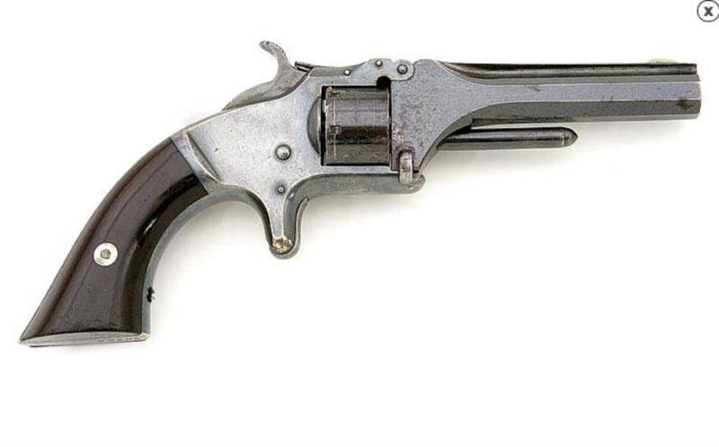 serial #39585, 22 short, 3 3/16" barrel with a very good bore. This little Smith remains in very nice condition with the barrel and cylinder retaining about 75% original blue finish which shows some light even flaking with those areas bearing a pleasing smooth brown patina. The frame retains 95% plus original silver plated finish which has taken on a nice blue tarnish. The two piece rosewood grips rate excellent with 95% original finish remaining. The hammer retains a good deal of original color case-hardened finish. A nice clean Smith in blue and silver.