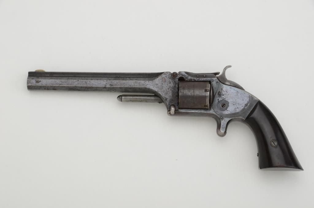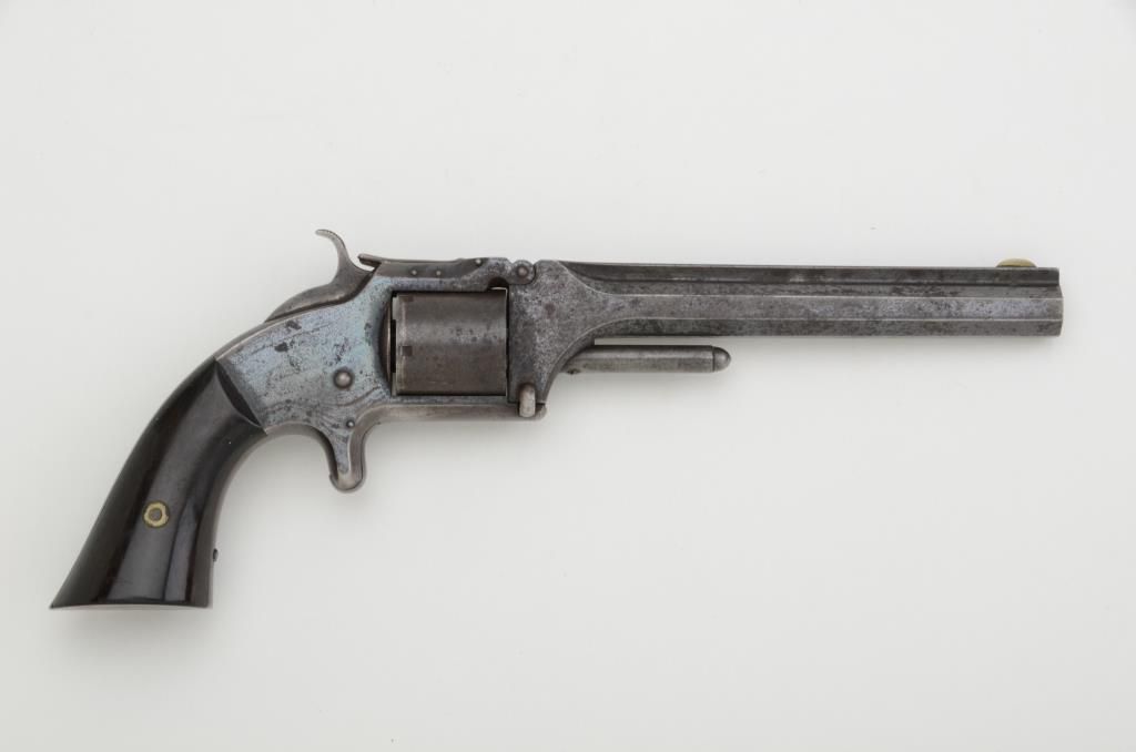 Smith & Wesson No. 2 Army spur trigger tip-up revolver, .32 cal., desirable 6” barrel, blue finish, rosewood grips, #26110. This gun is in overall very good to near fine uncleaned condition showing approx. 50%original finish, crisp action, sharp markings including patent dates on cylinder, very good + grips, bore shows scattered pitting; a nice No. 2 Army the way collectors like to find them. Est.: $500-$1,000.