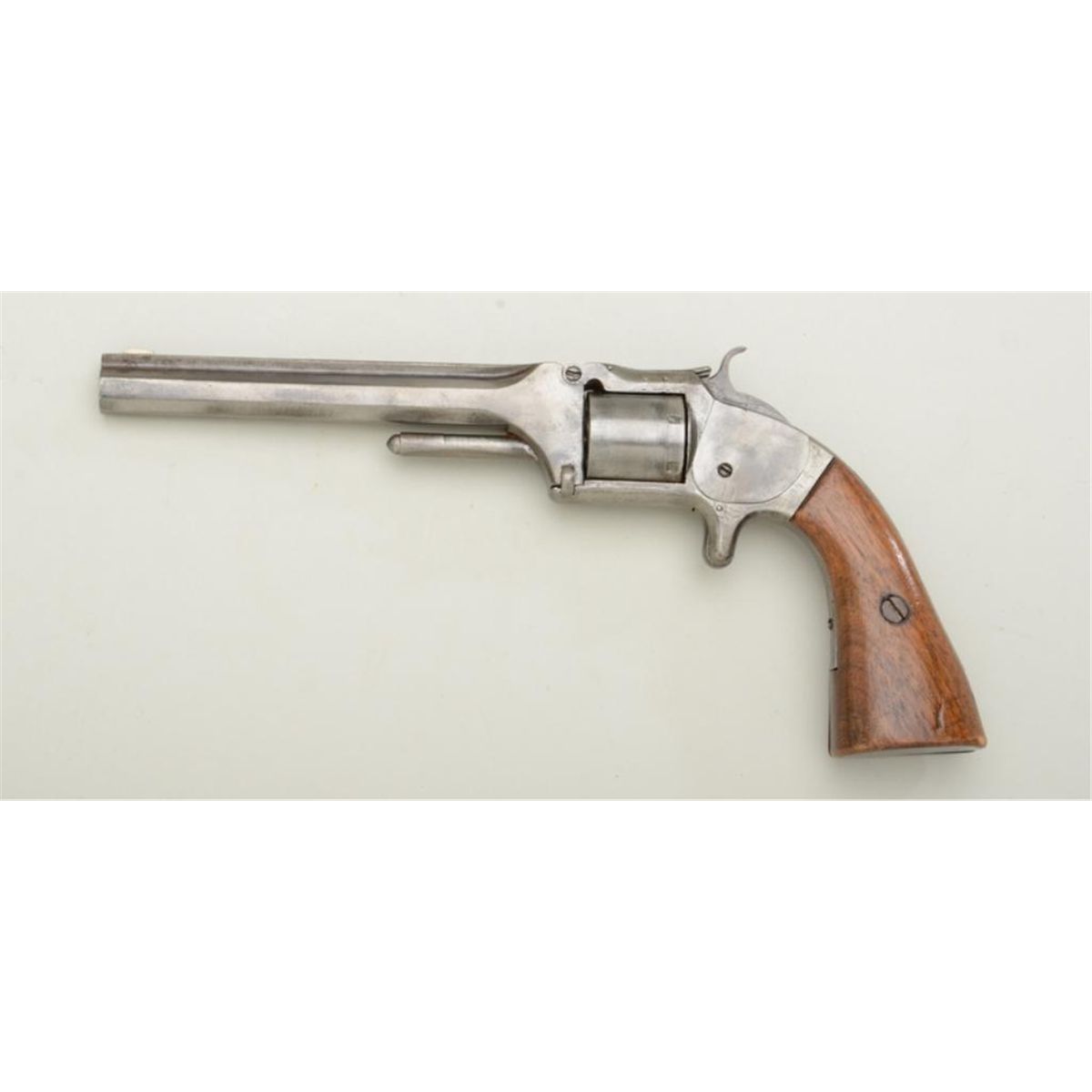 Smith & Wesson No. 2 Army tip-up revolver, .32 cal., 6” barrel, extended replacement grips, #_ _150. This gun is in fair condition showing an old heavy cleaning to metal surfaces, dark bore, fair action, fairreplacement grips. Est.: $100-$200.