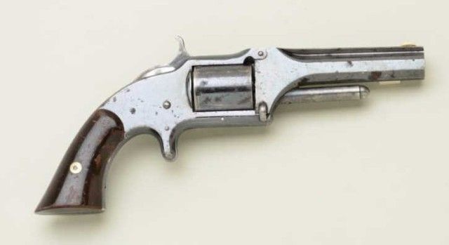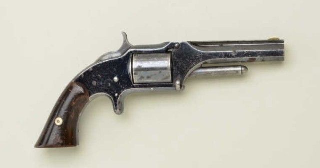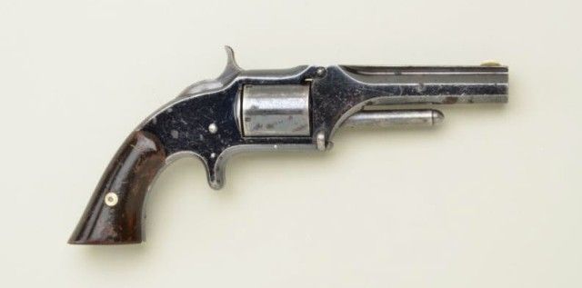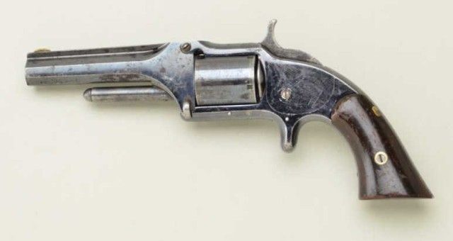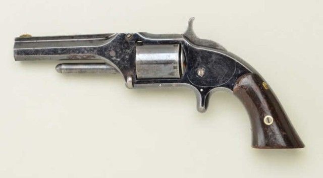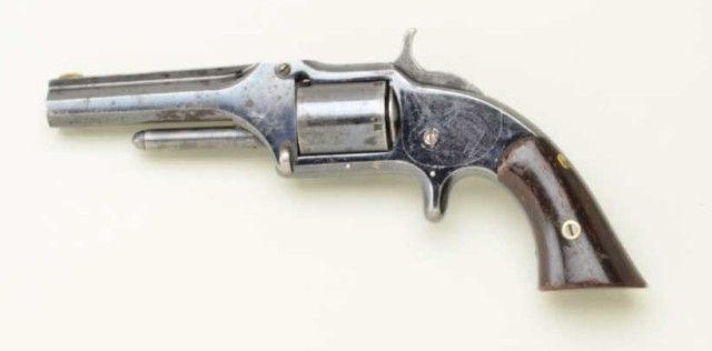Smith & Wesson Old Model 1-1/2 spur trigger revolver, .32 cal., 3-1/2” octagon barrel, blue finish, rosewood grips, #21310. This gun is in overall very good to fine condition showing approx. 75% original blue finish,with scattered spots of erosion and high point wear; crisp action, very good markings, bore is overall good to very good; grips are very good with scattered losses to original varnish and a couple dings and mars fromstorage; lots of original bright blue on this S&W! Est.: $500-$1,000.