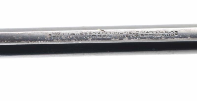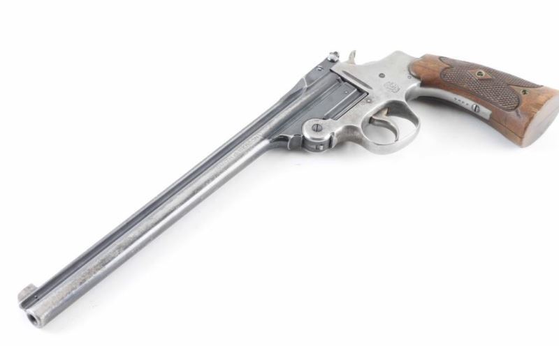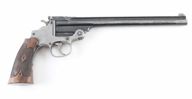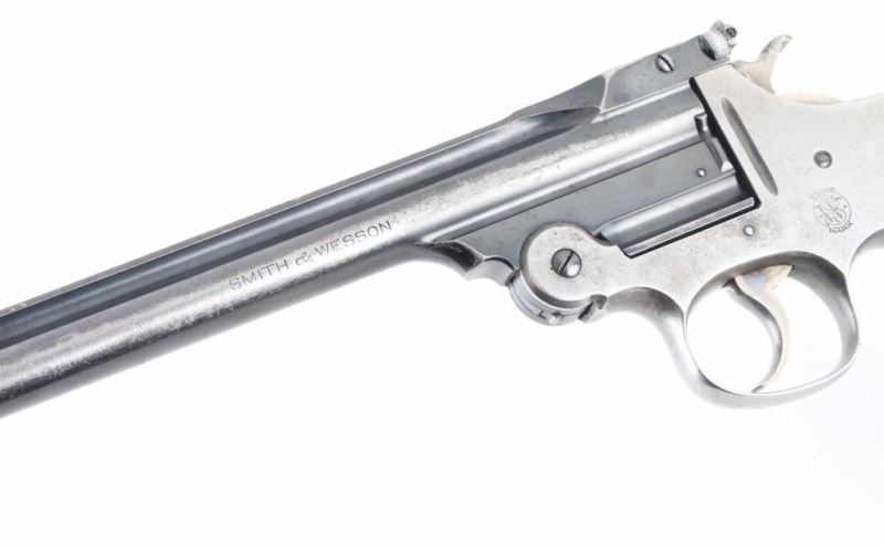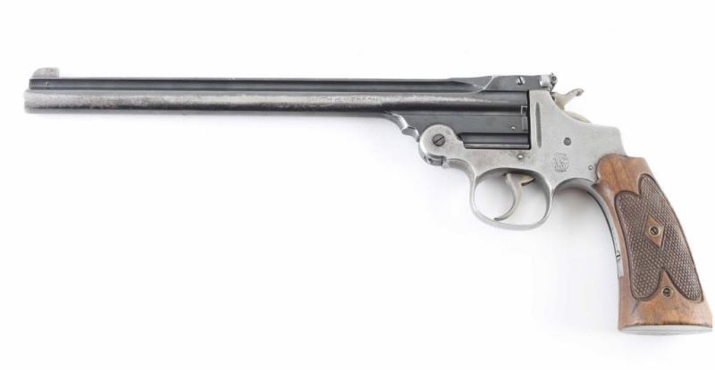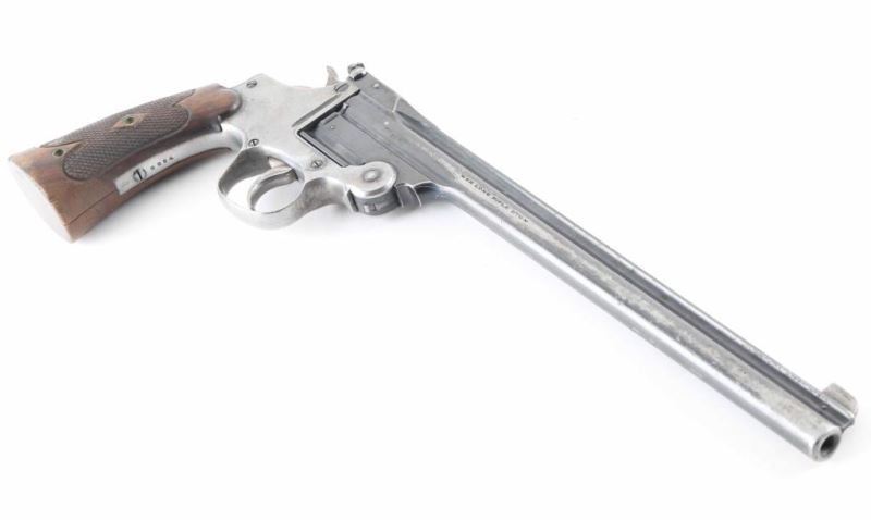 Sn: 9954 'Model of 1891' "Perfected Target Model" (Third Model) Pistol. Single-Shot. Break-Top. Circa 1909-1923. Fires S/D action.10" ribbed barrel with front blade, and notch rear sights. Blue finish, case-hardened hammer, and triggerguard. Smooth trigger. 2-line S&W address/patent date on barrel rib. S&W trademark on left frame. "Smith & Wesson"of left side of barrel. Serial # on fore strap. Bore appears very good, with strong rifling. Barrel locks up tight. Blued finish is about 30% with edge wear/scratches. Frame is mostly in the white. Checkered walnut extension type grips without S&W monograms. NRA Condition-Very Good. Modern Firearm. Sn: