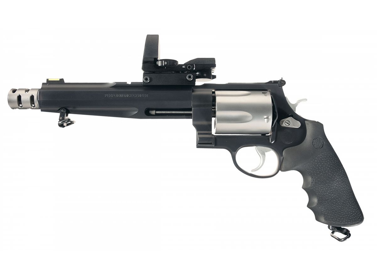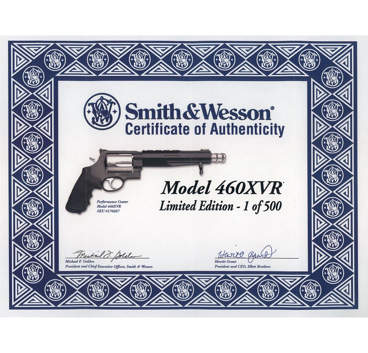 Introduced in 2005, limited edition model 460XVR (1 of 500). Fitted with a 1 1/4 inch long compensator. Equipped with a green hi-viz interchangeable front sight, an adjustable rear sight and an integral Weaver style scope mount with a Target Sports holographic red dot scope mounted. Textured wraparound finger groove S&W rubber grip. There are two sling swivels attached. With factory shipping box numbered to the gun, cable lock, extra scope mount, and papers. Performance Center embroidered zipper case and Uncle Mike's detachable sling and swivels. Comes with Smith & Wesson certificate of authenticity.