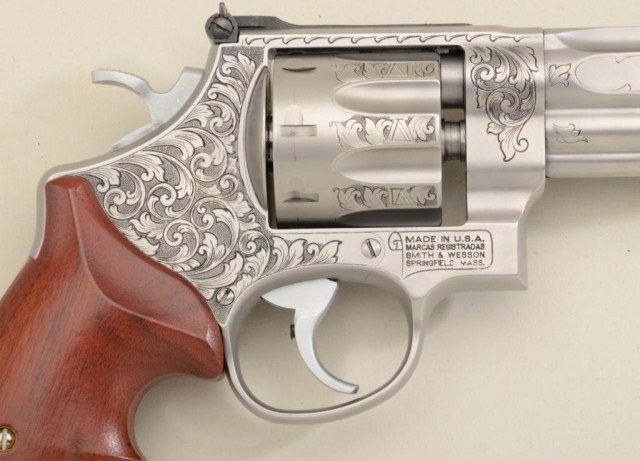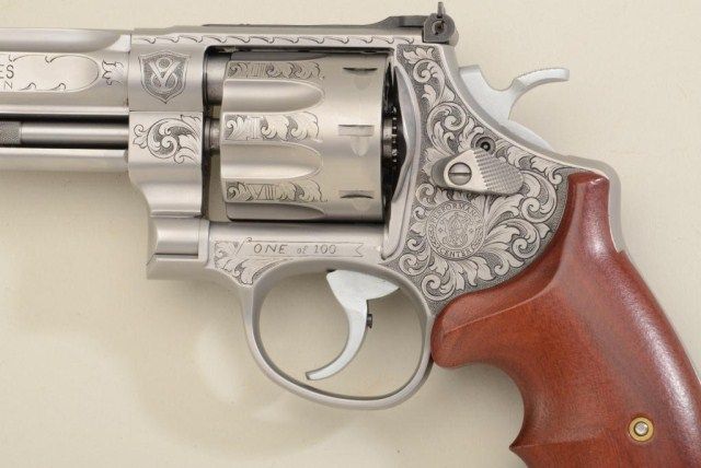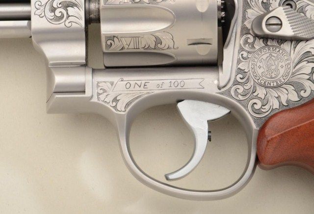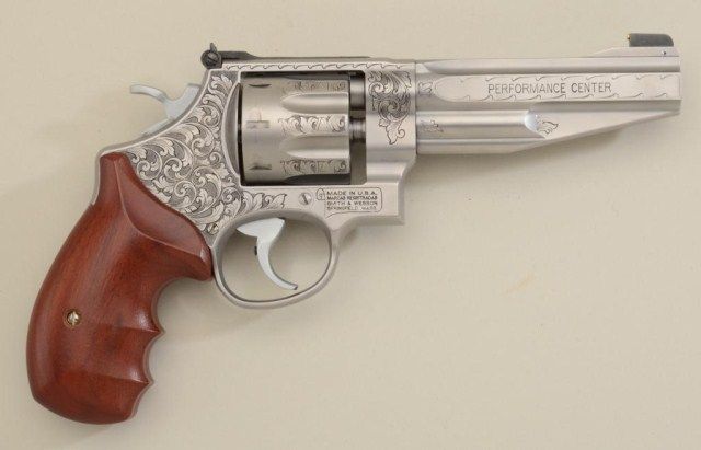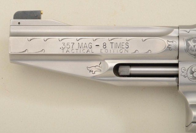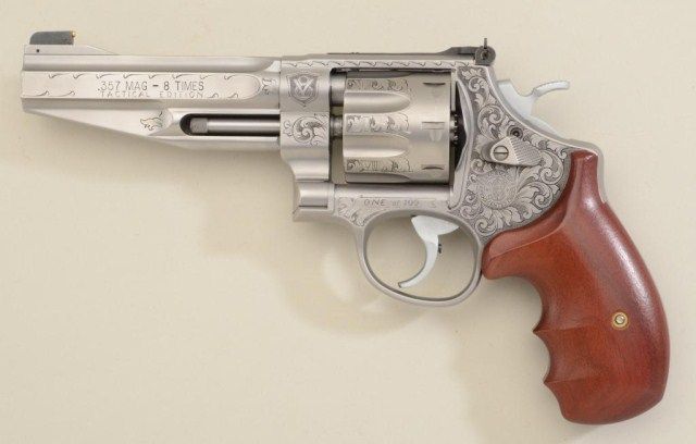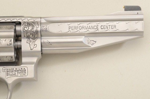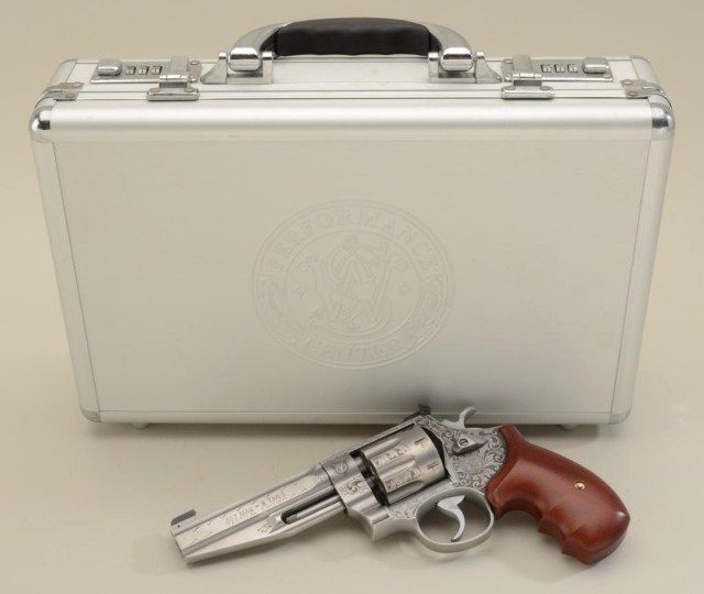 Smith & Wesson Performance Center Model 627-5 DA revolver, 8-shot Tactical Edition, .357 Magnum cal., 5” barrel, engraved stainless steel, finger groove wood grips, #BCF5535 in lockable suitcase Performance Center aluminum hard carry case. This gun is in like new condition showing little handling; accompanied by safety and instruction manual; original retail cost per consignor was $3,900. Est.: $1,500-$3,000.
