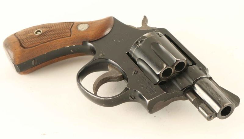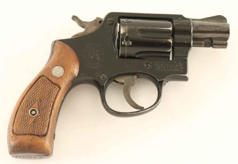 '38 Military & Police Airweight' Lightweight medium frame double action revolver chambered in 38 Special, manufactured circa 1953. Features a blued/black finish, pinned 2" barrel with sighting rib, ramp front sight, square notched rear sight, non-shrouded ejector rod, alloy six-shot cylinder, serrated .240" trigger, .240" hammer, flat latch thumb piece, five screw round butt K alloy service frame and two-piece diamond checkered walnut Magna grips with silver S&W medallions. The revolver retains approximately 85% of it's original finish showing light holster wear, scattered losses with and a small amount of light surface rust on the barrel. Action is smooth with tight lock up, bore is very good and the wood grips are good as worn semi smooth. Condition is NRA Good. ***C&R Firearm****