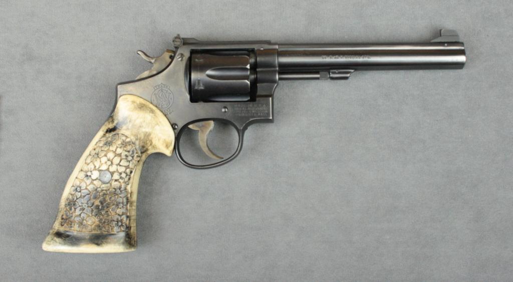 Smith & Wesson Pre-Model 14 DA revolver,  desirable 5 screw frame, blue finish, custom  plastic target grips, #K88358. This gun is in  overall fine condition showing approx. 97%  original finish, fine bore, crisp action andmarkings, good grips.  Est.:  $200-$400.