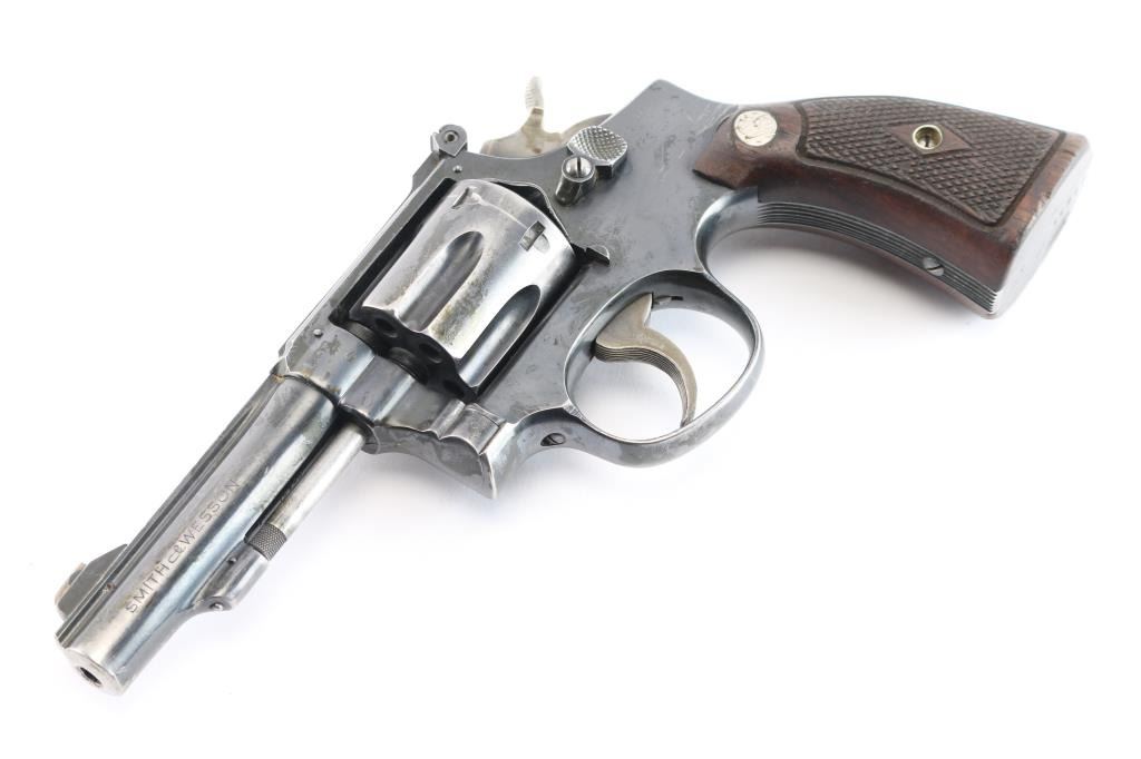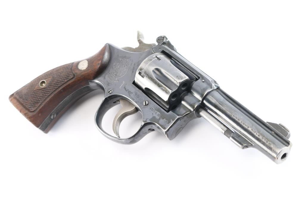 Also known as the K-22 Masterpiece (Pre-Model 17) Double Action Revolver chambered in .22 Long Rifle manufactured circa 1947 in the United States. Built on a square butt K frame 3 screw target frame. It features a blued finish, fluted 6 shot counterbored cylinder, checkered wood target style grips with S&W medallions, cut down 4" ribbed pinned barrel, pinned raised ramp front sight, adjustable rear sight, serrated grip straps, serrated case colored curved grooved wide trigger, and case colored medium wide hammer with checkered checkered hammer spur. Bore is dirty, but appears bright with strong rifling. The revolver retains about 75% finish with fading along the barrel, and scattered scratches. The grips are good with a little wear to the points, some edge wear, and handling dents. Action is smooth and tight. Serial number matched on heel, extractor star, cylinder, grip panel, and barrel.